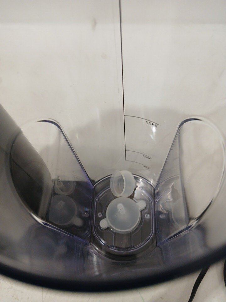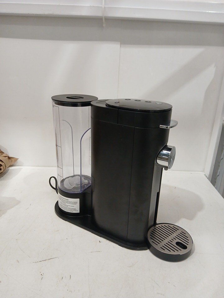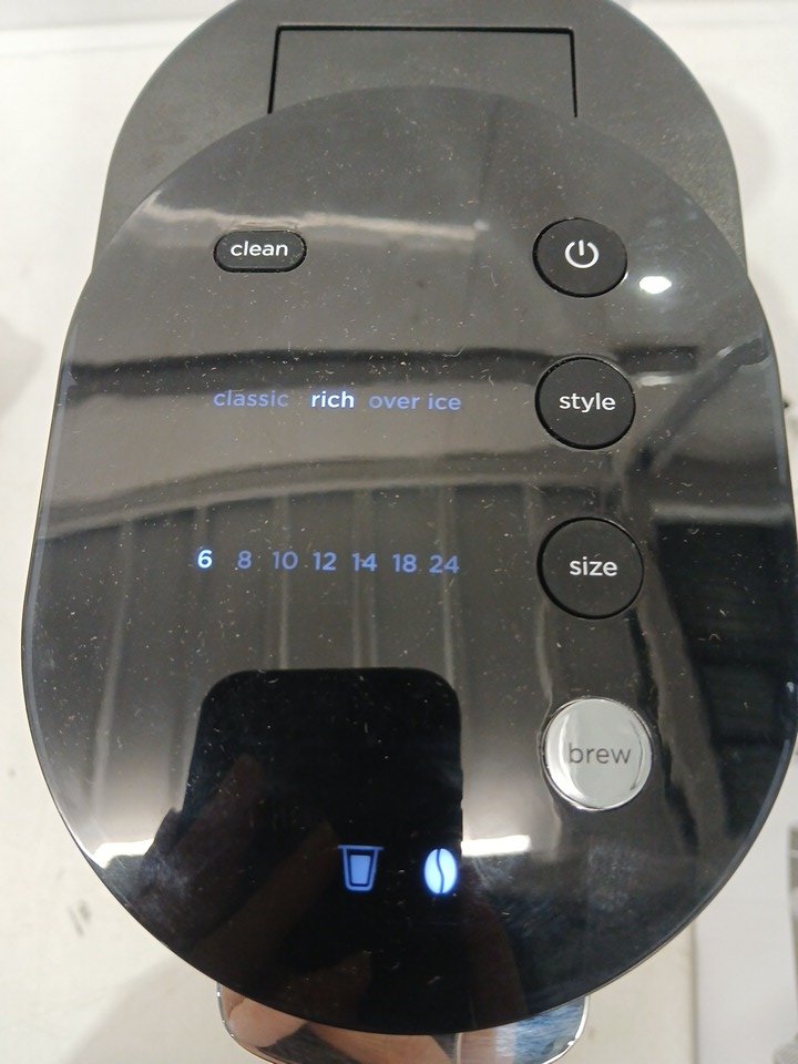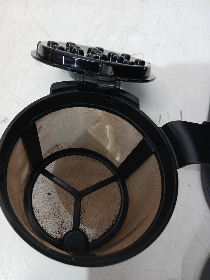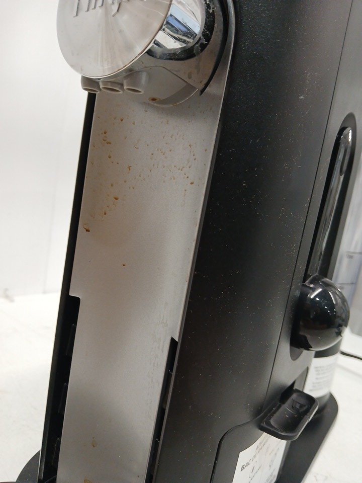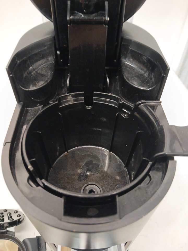 Tested for power. Has some residue on the front of the machine. Has some water marks in the tank and some grounds in the filter.