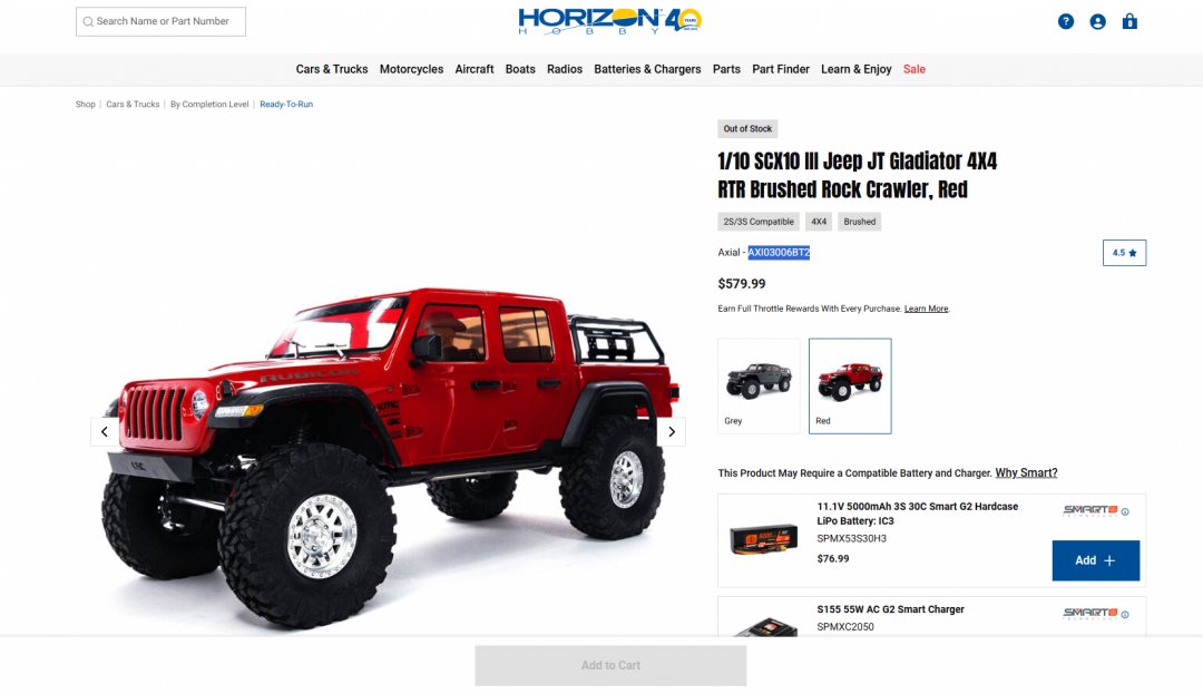axial scx10 iii jeep gladiator jt electric 4wd RTR Brushed Rock Crawler - 1/10th scale - red - (model:AXI03006BT2)