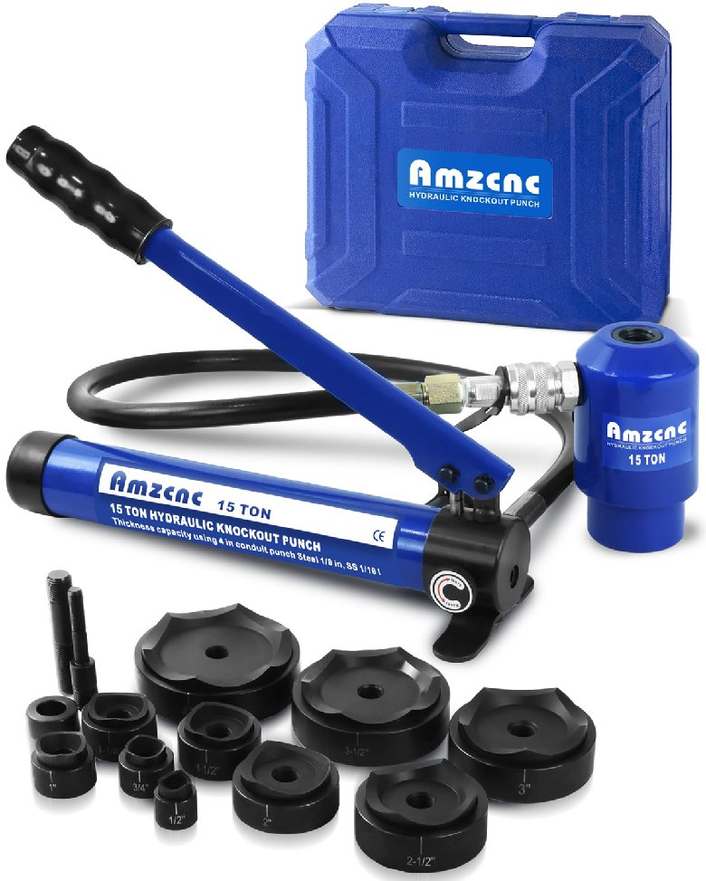 AMZCNC Hydraulic Knockout Punch Electrical Conduit Hole Cutter Set - 15 Tons - Conduit 1/2" - 4" - Black/Blue (Model: YYKK)
