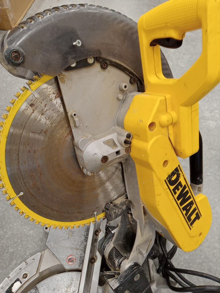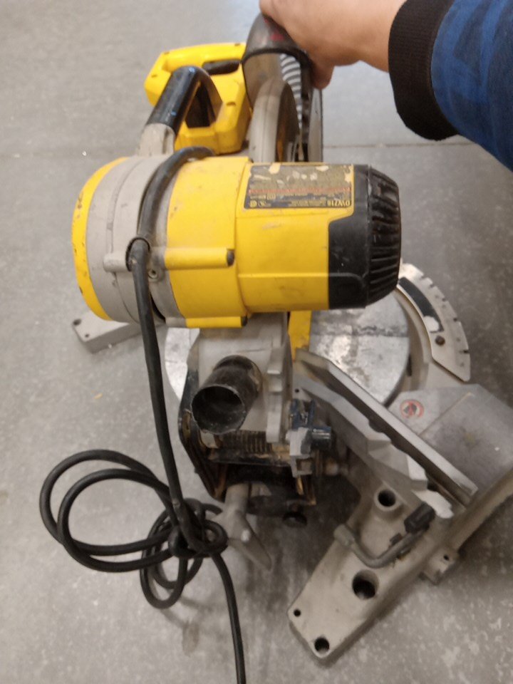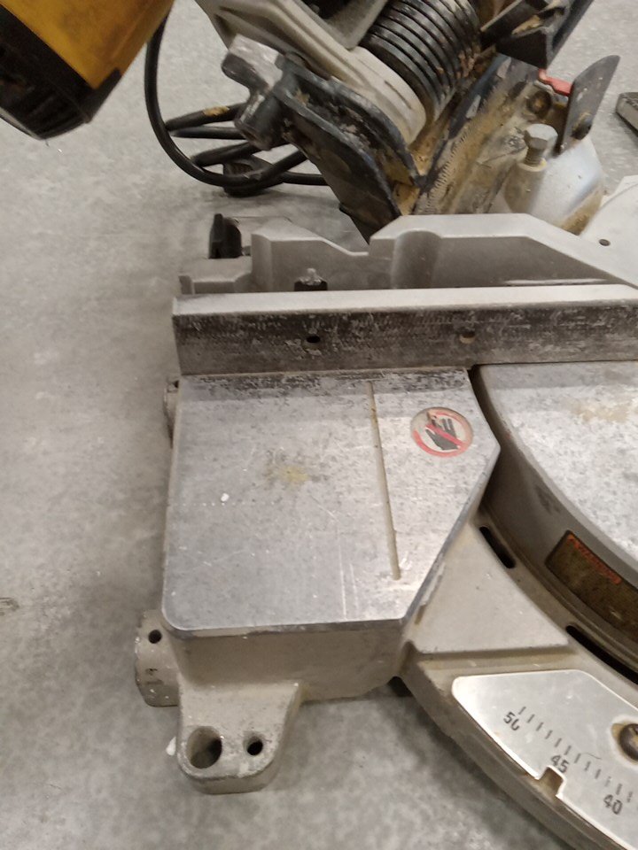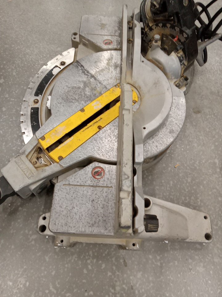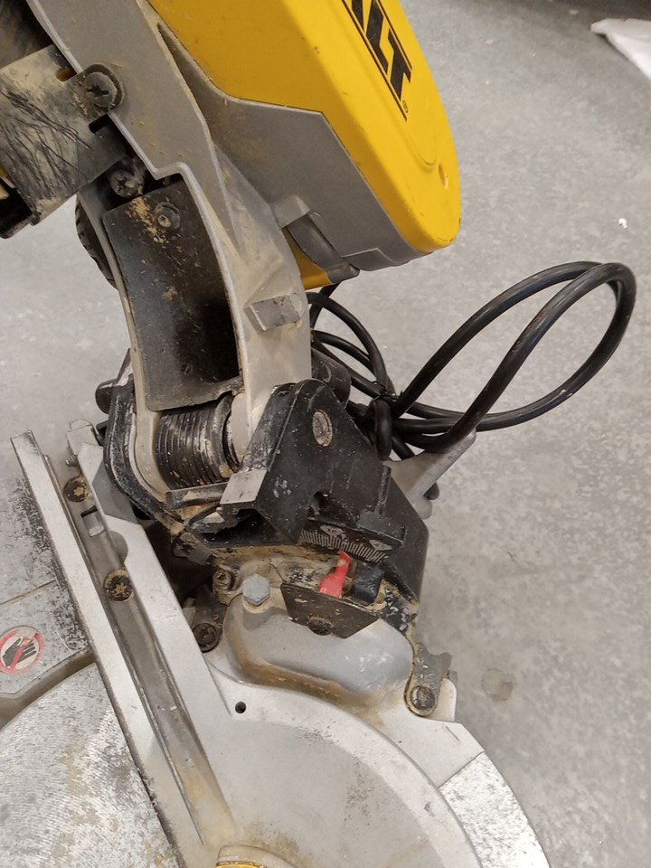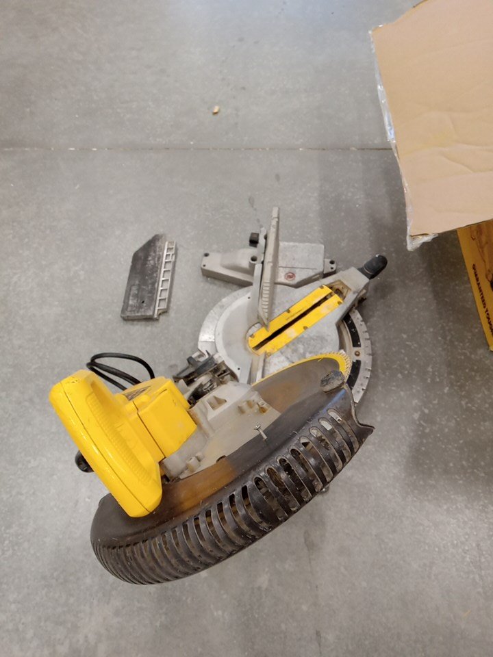 Item shows heavy signs of being previously used prior to being returned. Item tested and working. There is a small part in the power cord that is a bit exposed from a slight tear in it. There are scuff marks/scratches/debris all over the item as a result from previous use/shipping/storage. There is no lock that holds the saw down in place when not in use (it appears that piece is missing/broken). The dust bag and blade wrench are also missing. See attached photos.