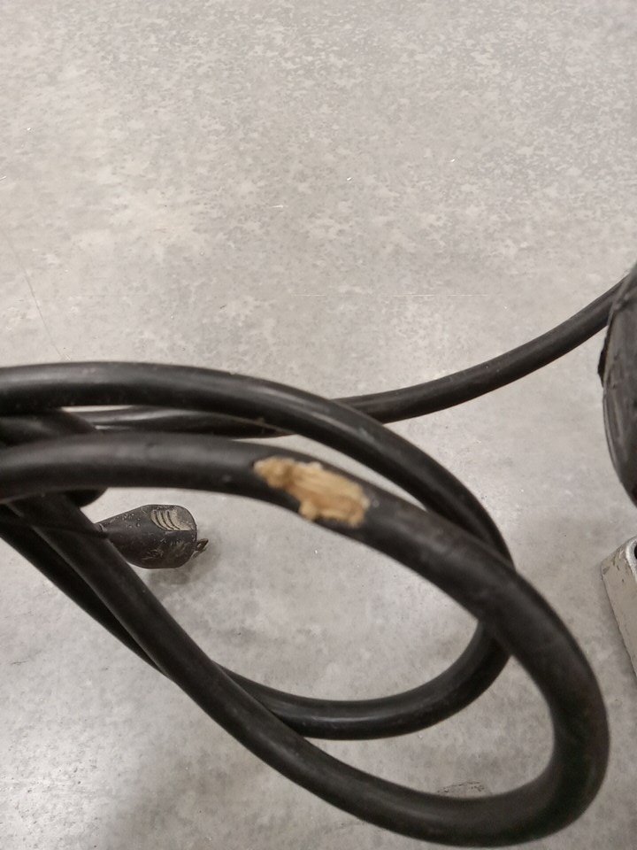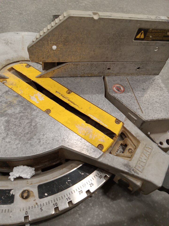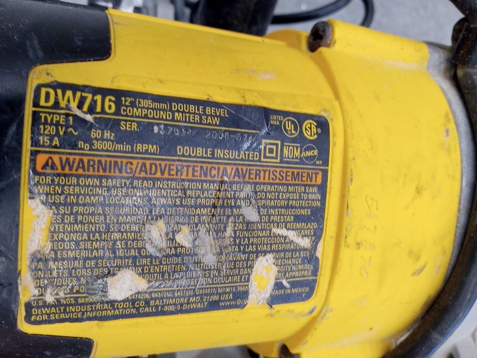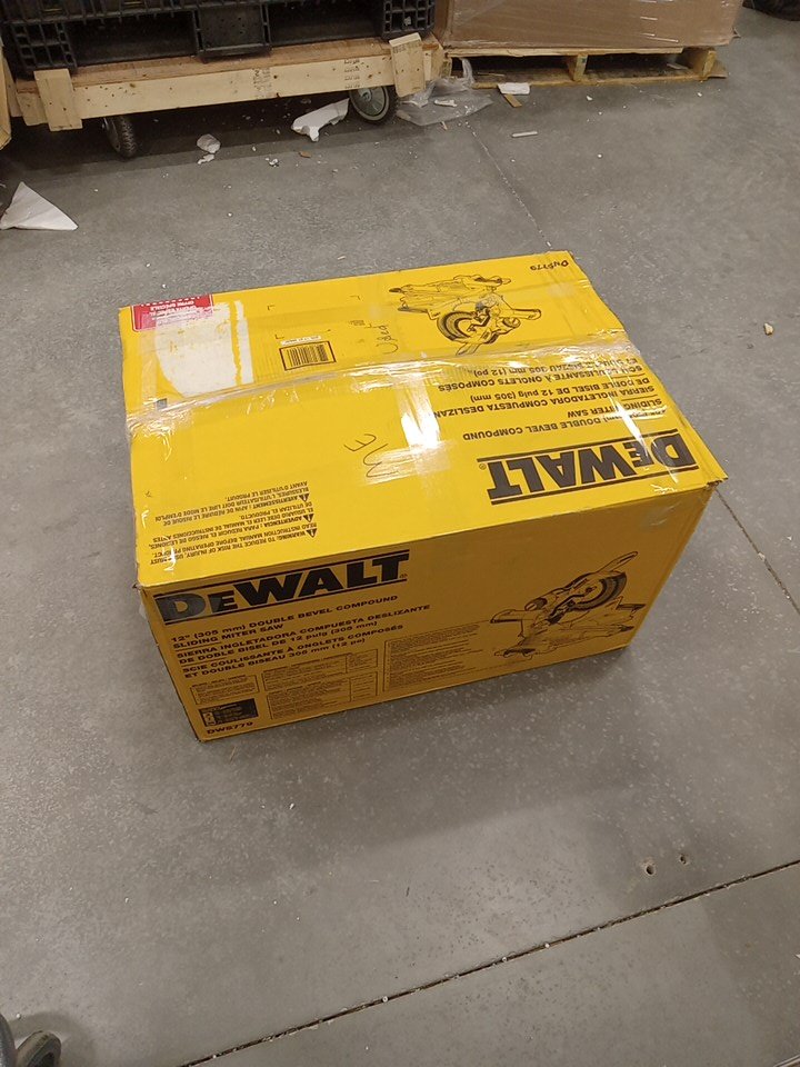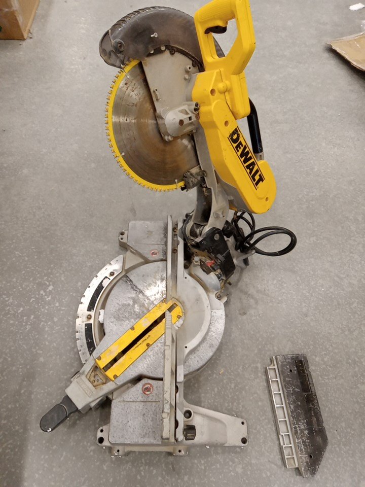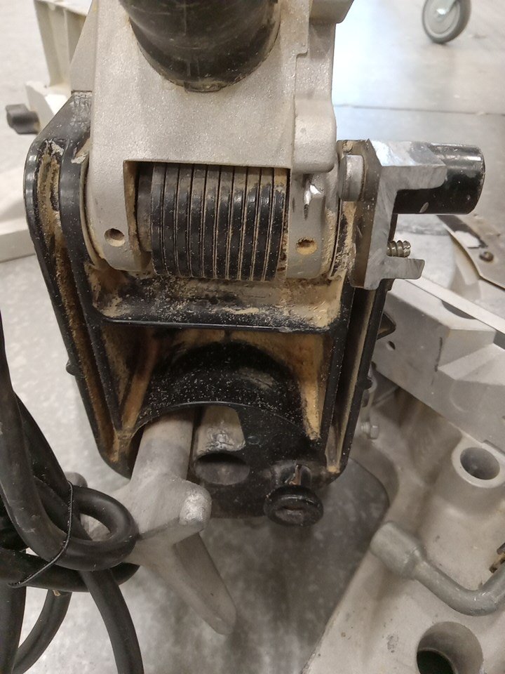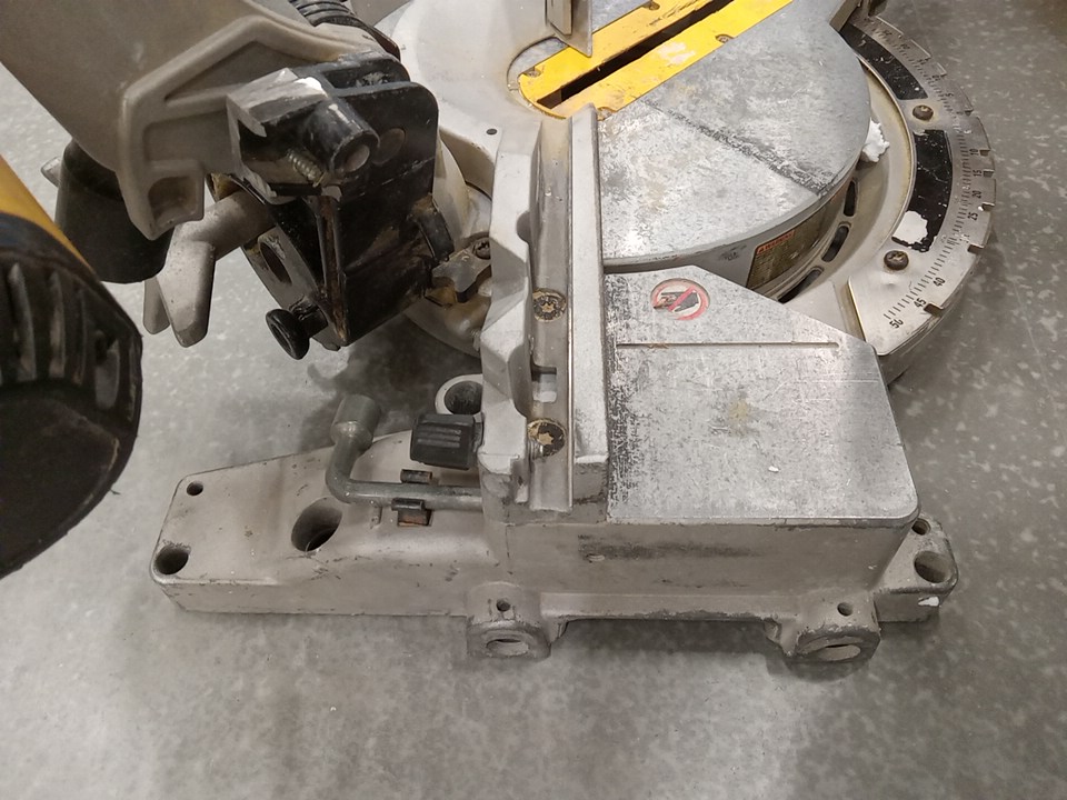 Item shows heavy signs of being previously used prior to being returned. Item tested and working. There is a small part in the power cord that is a bit exposed from a slight tear in it. There are scuff marks/scratches/debris all over the item as a result from previous use/shipping/storage. There is no lock that holds the saw down in place when not in use (it appears that piece is missing/broken). The dust bag and blade wrench are also missing. See attached photos.