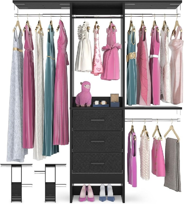 Besiost Small Closet System with 3 Fabric Drawers - 48" L x 13" W x 71" H - 4ft - black (MODEL: DYK-81)