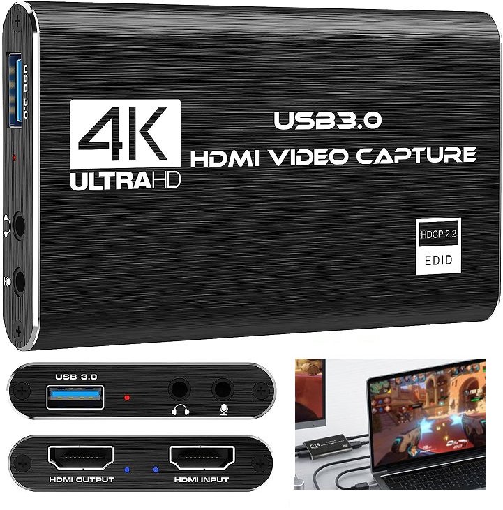 4K HDMI Video Capture Card - USB3.0, 1080P, 60FPS Video Recorder, for Streaming, Gaming, and Broadcasting - black