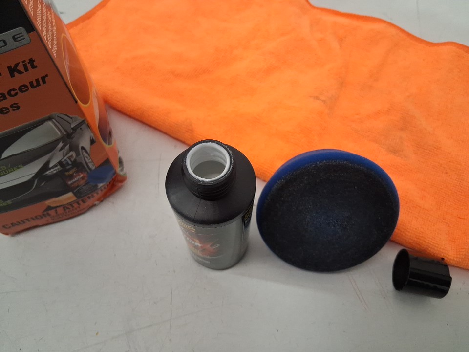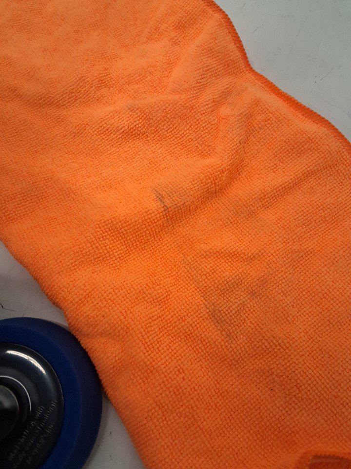 Bottle has small amount used out of it. Cloth has small black stains and buffer disc is discolored