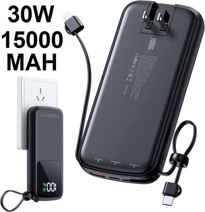 loveledi portable charger & power bank with wall plug and outlet cables - 15000mah - 30w - black (model: ac6 pro)