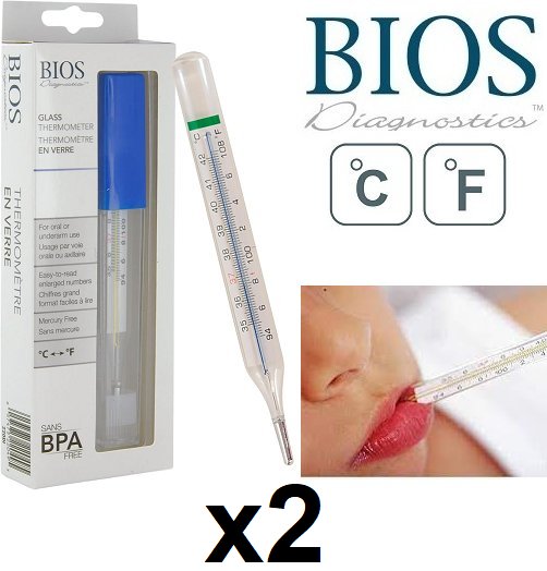 2 BIOS Diagnostics Glass thermometer with case for oral or underarm use (model: 22ODI)