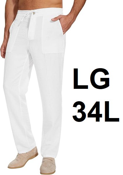 Mens SEVEGO Elastic Waist Drawstring Straight-Leg Casual Linen Pants - LARGE/ 34" LONG - WHITE