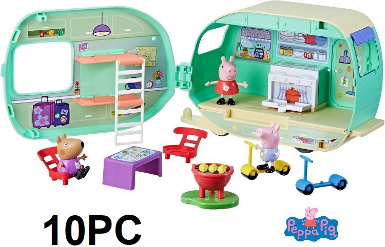 10PC Peppa Pig Caravan Playset with 3 Figures and 6 Accessories - multicolor