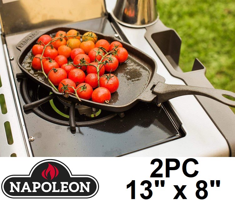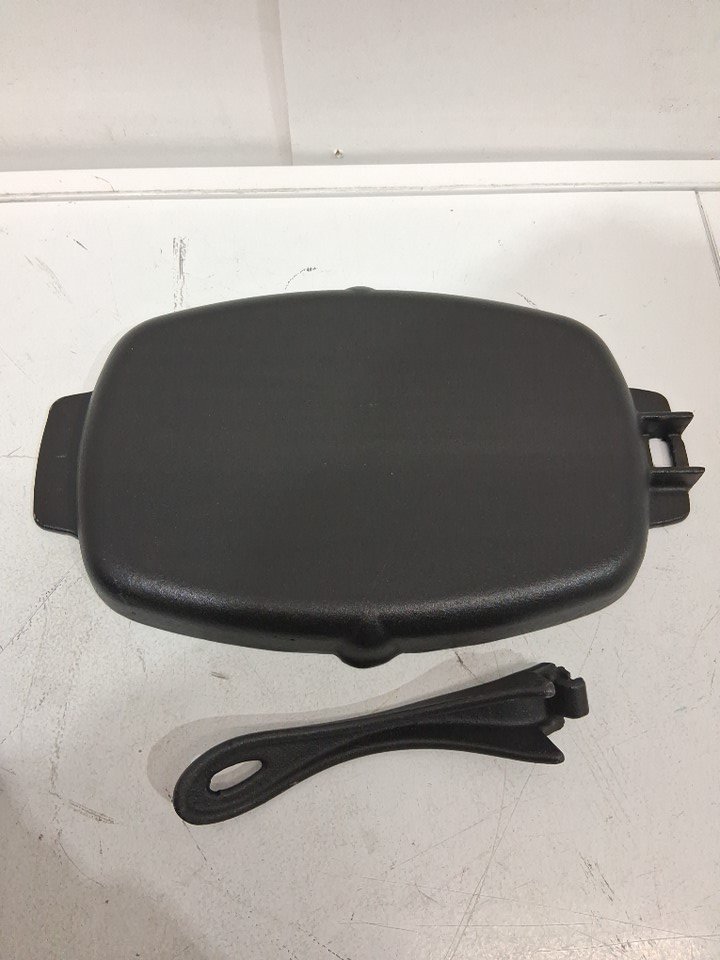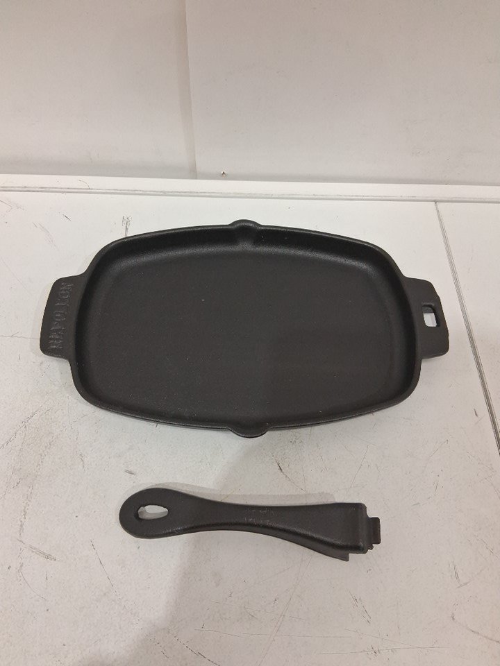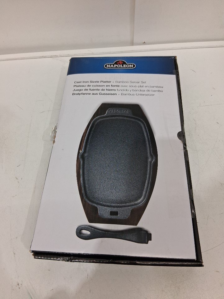 item missing bamboo serving platter, cast iron has light scratches on bottom