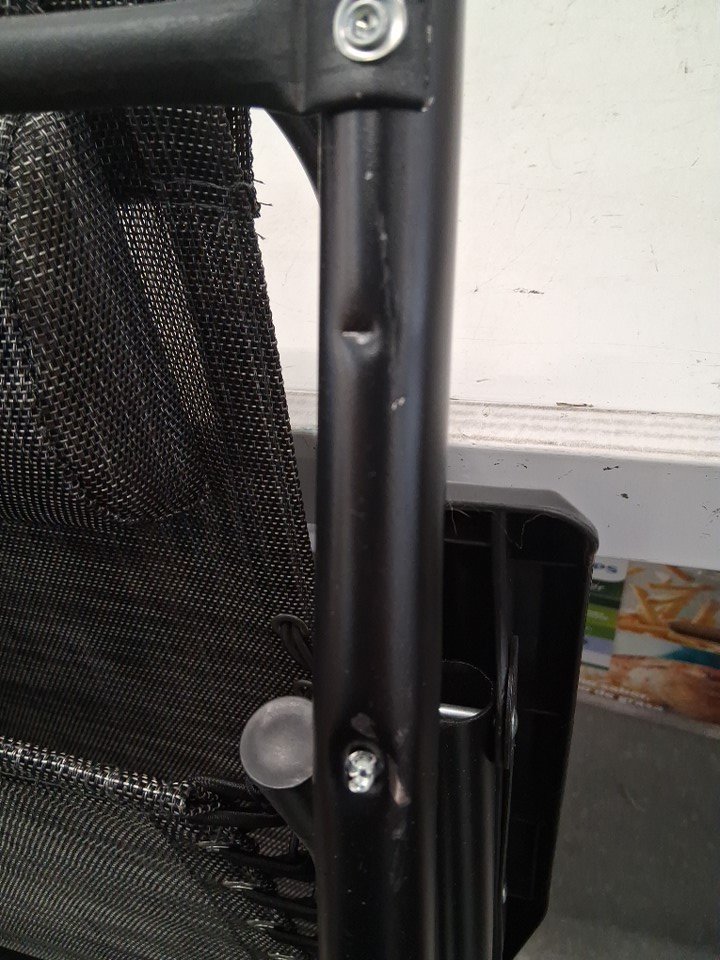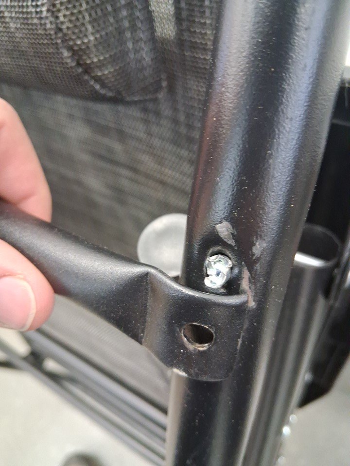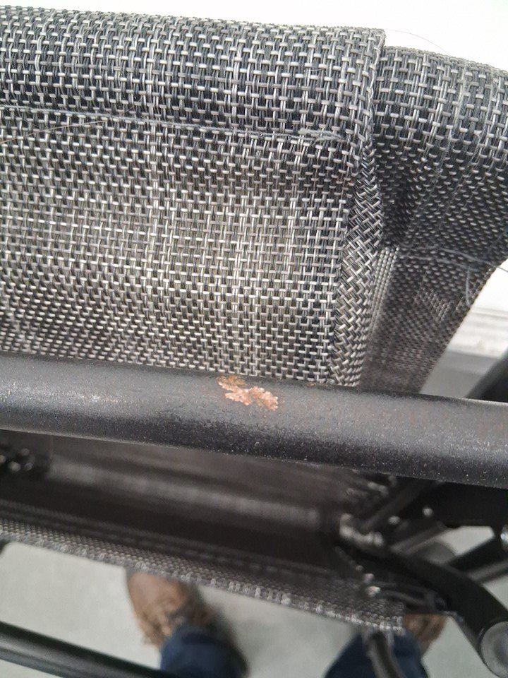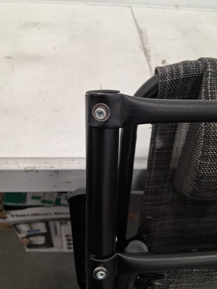 One of the metal washers that holds the footrest rods in place on one side has snapped, leaving the end of the rod hanging loosely. Customer will need to source a replacement or otherwise fix the rod in place in order to reliably use the footrest. Additionally, there are some scuffs on the bottom of the frame and some dust/dirt on the armrests indicating some previous use - see photos. Outside of these issues, appears to be in very good condition.
