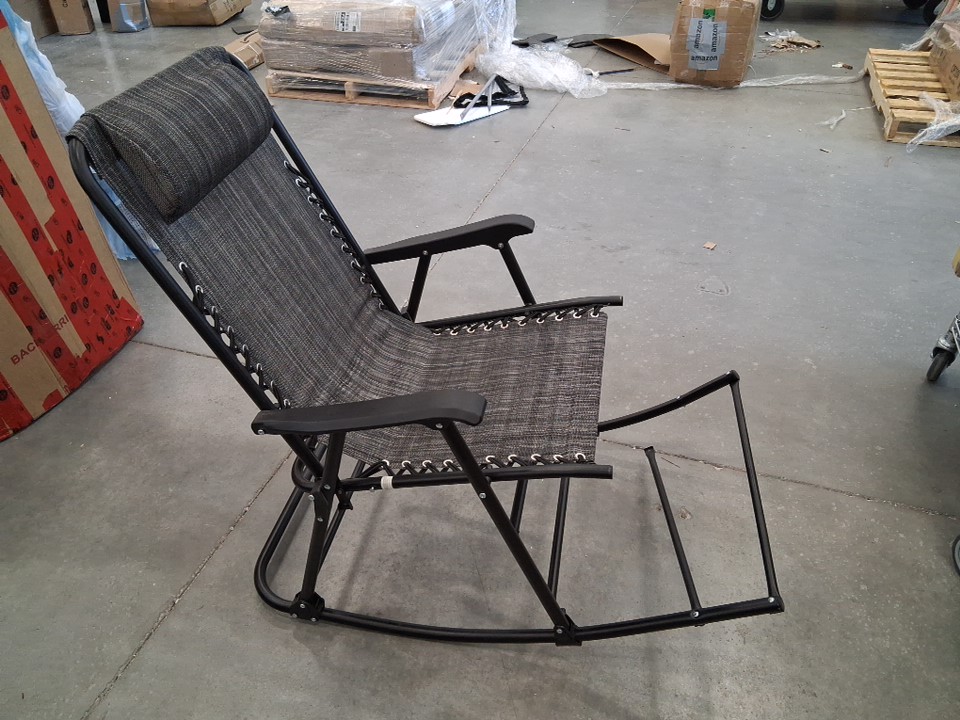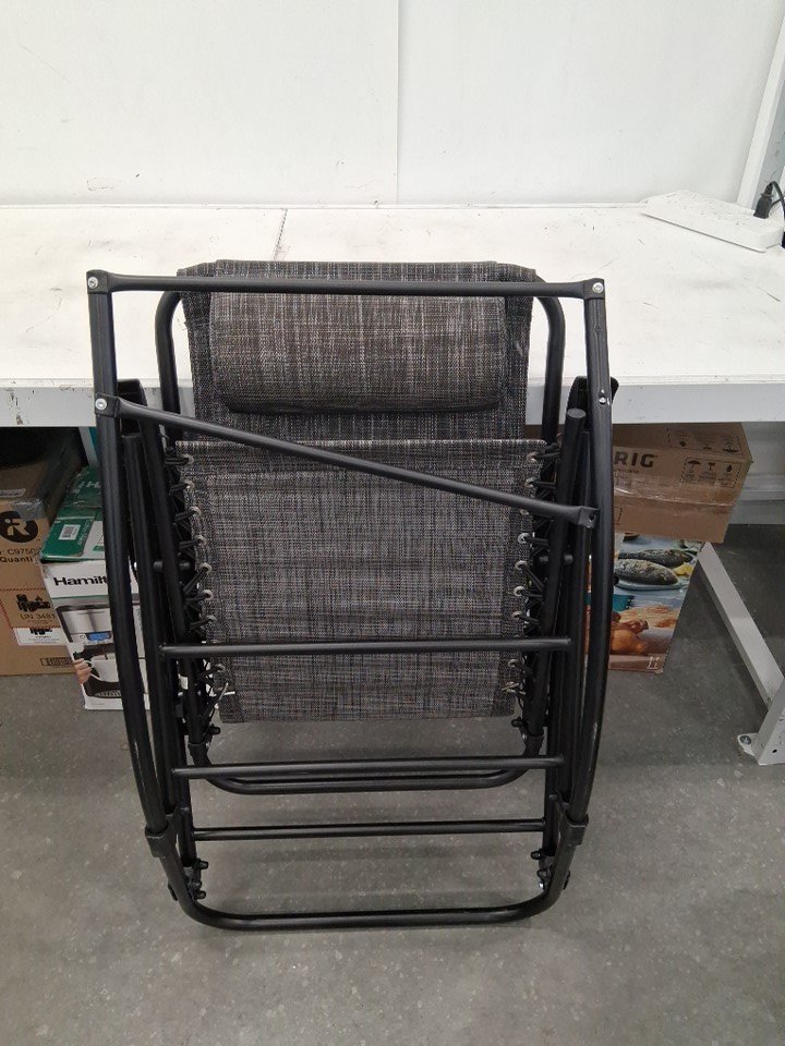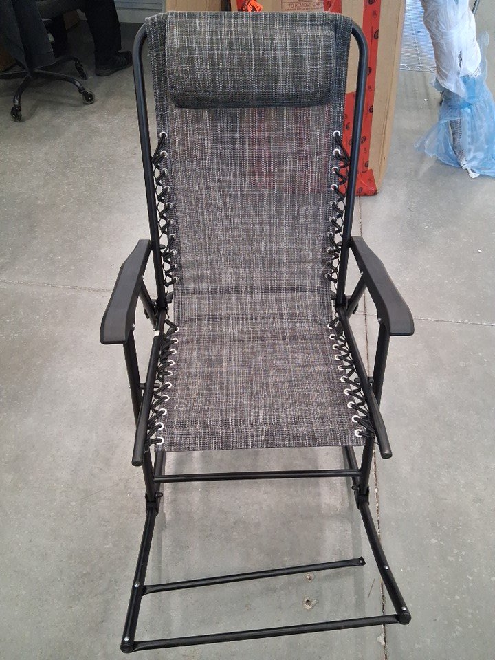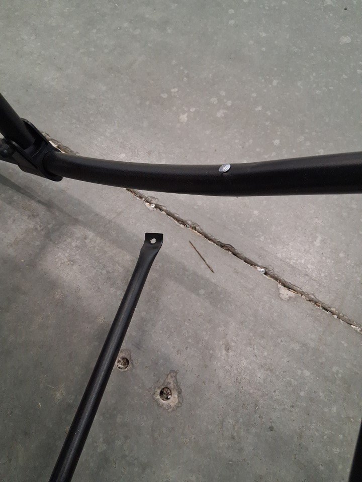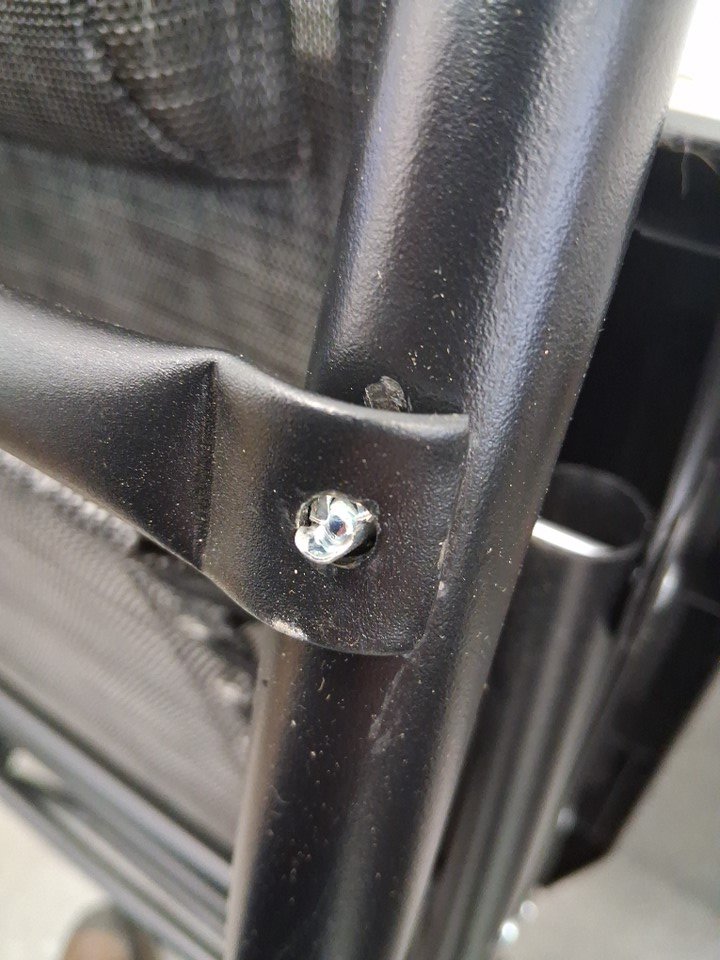 One of the metal washers that holds the footrest rods in place on one side has snapped, leaving the end of the rod hanging loosely. Customer will need to source a replacement or otherwise fix the rod in place in order to reliably use the footrest. Additionally, there are some scuffs on the bottom of the frame and some dust/dirt on the armrests indicating some previous use - see photos. Outside of these issues, appears to be in very good condition.