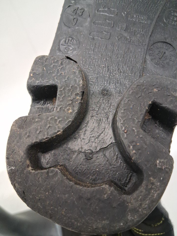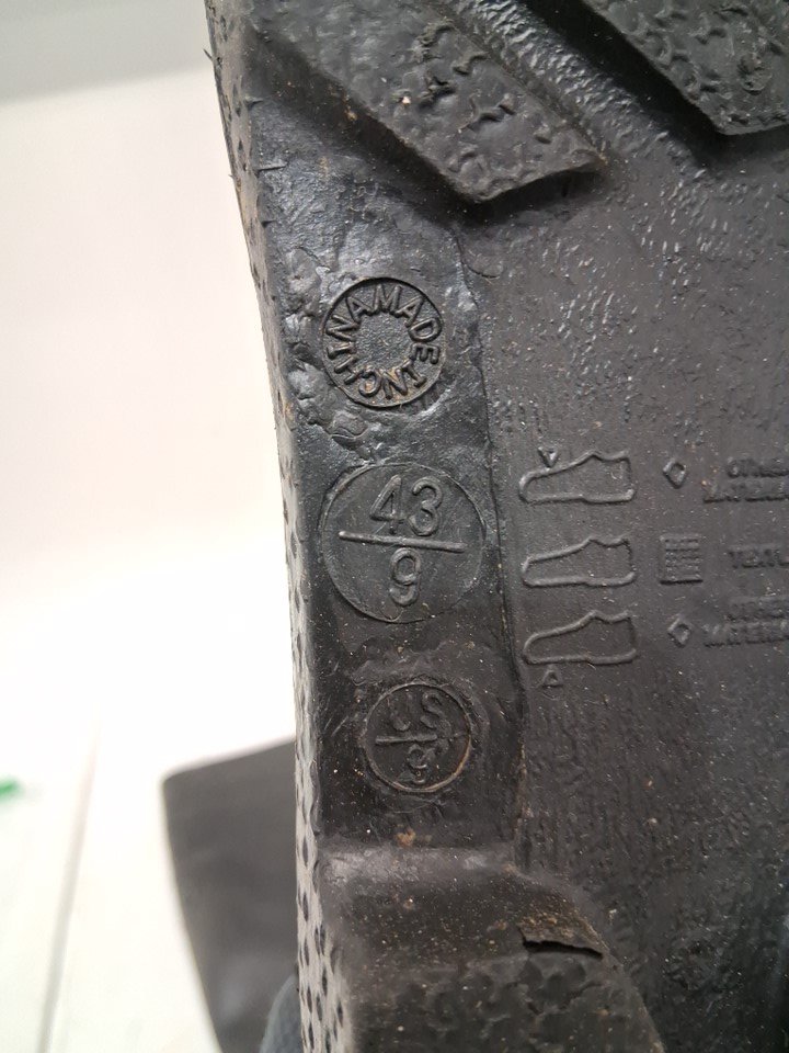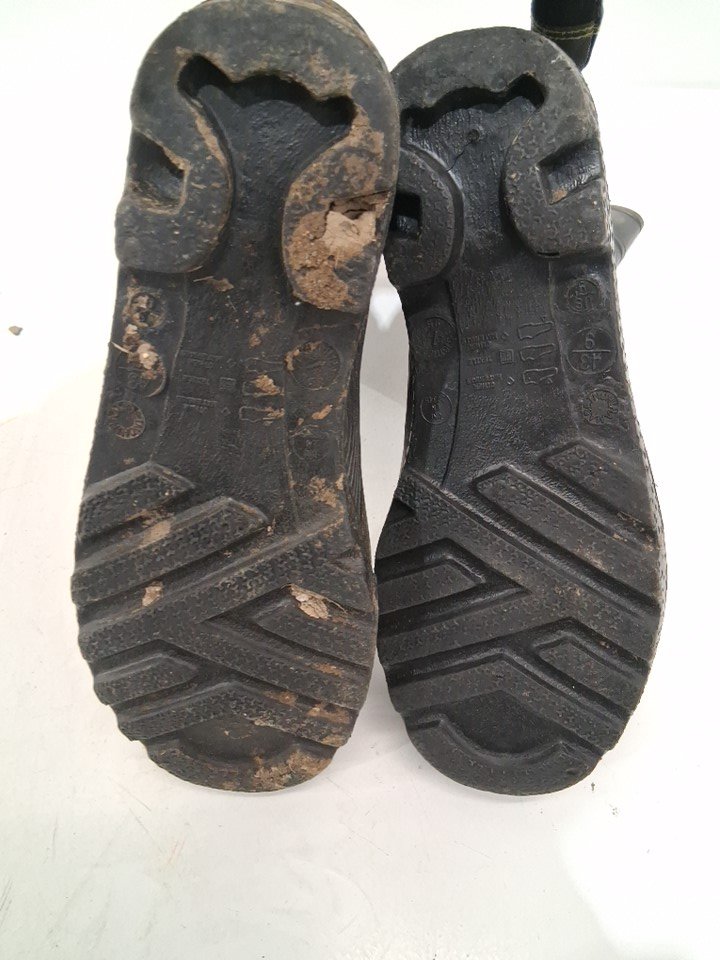 please note the product was discovered to be covered in dust, dirt, mud, and clay, this can be cleaned. we also found that the fabric inside was fraying, the rubber bottoms are cracked, and the tread in slightly worn. the product's insoles were also found to be worn and torn up, this can be replaced, please see photos for more details