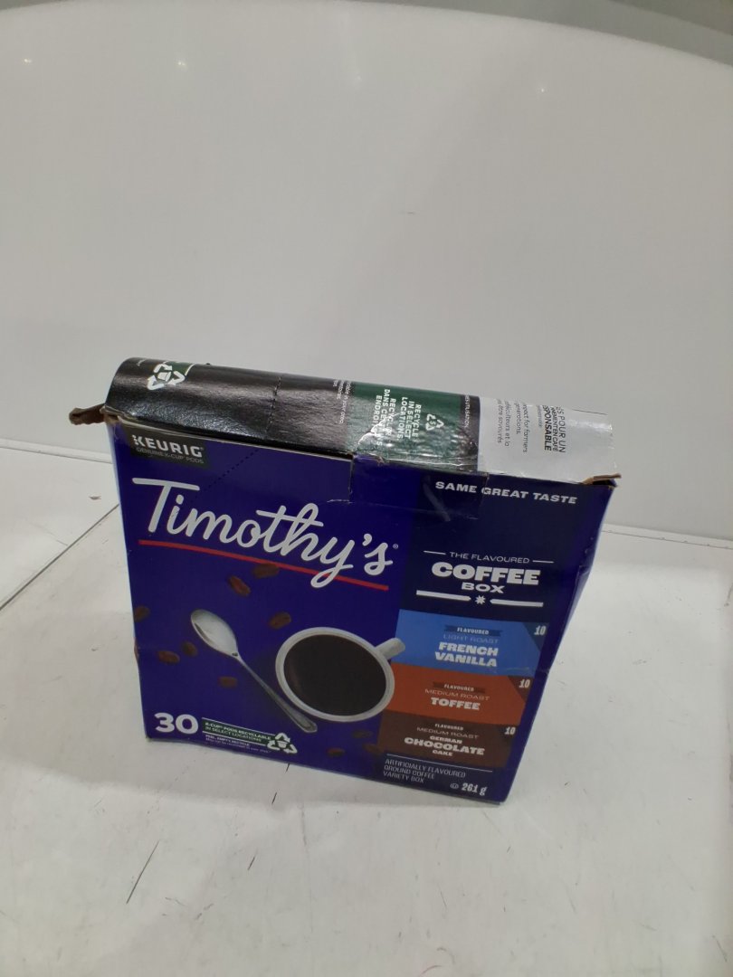 30pk timothy's the flavoured coffee box keurig k-cup pods- light roast french vanilla, medium roast toffee, medium roast german chocolate cake