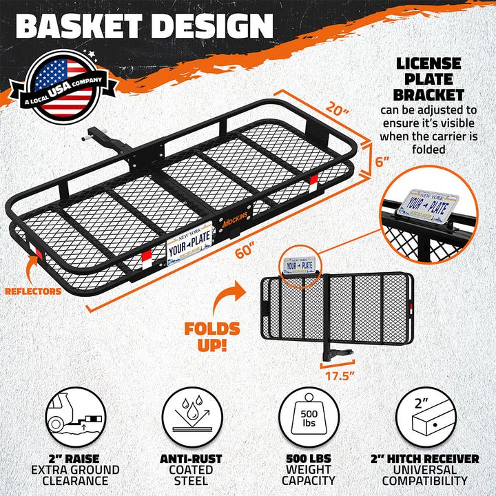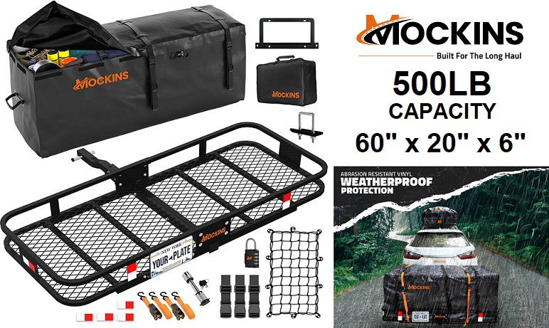 Mockins Hitch Mount Cargo Carrier & 16 Cu. Ft Waterproof Cargo Bag for Truck Bed (WITH NET) Weatherproof 500 LBS Cap Car Trailer Hitch Rack - Black (Model: ‎MA-HC-60X20-16BLK-27)