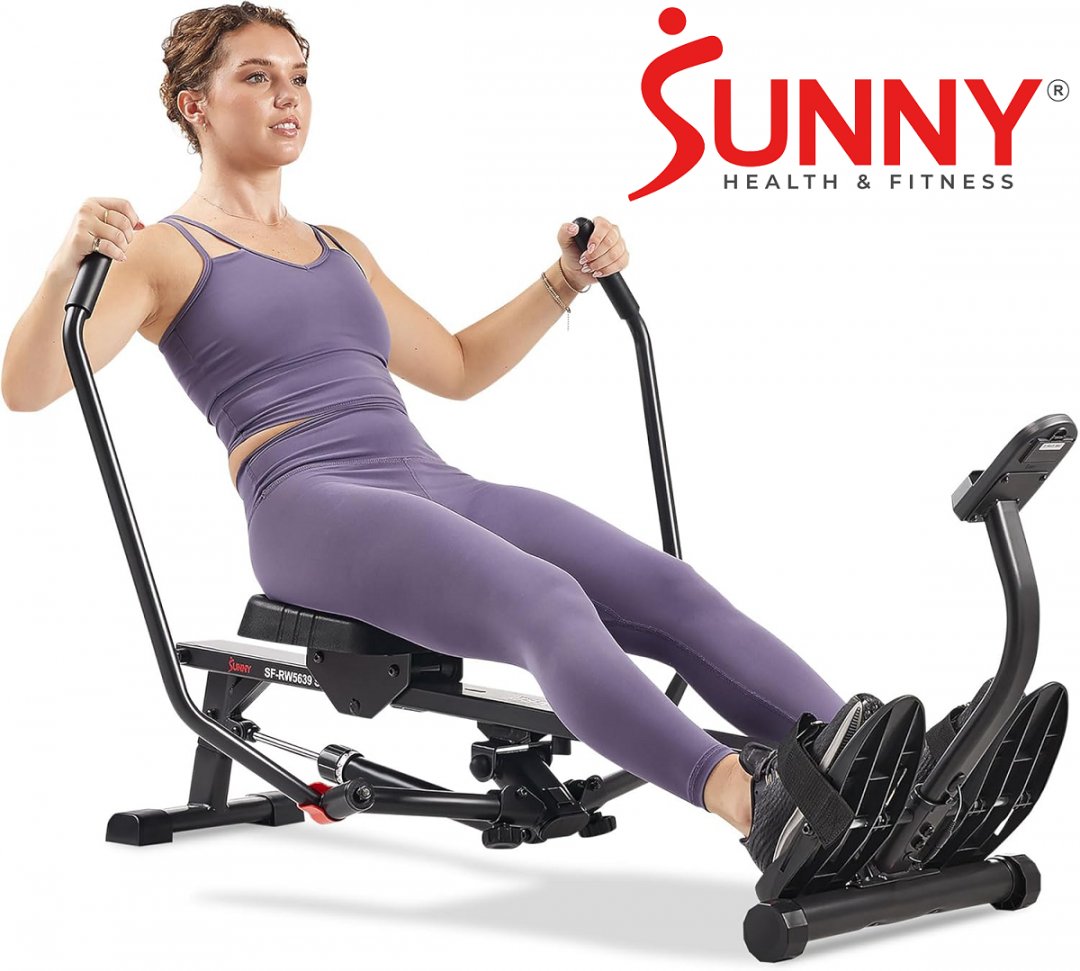 Sunny Health & Fitness Compact Full Motion Rowing Machine with 12-Level Adjustable Resistance, SunnyFit App Integration, 360° Motion Arms, Digital Monitor, Ergonomic Seat and Non-Slip Pedals (Model: SF-RW5639 SMART)