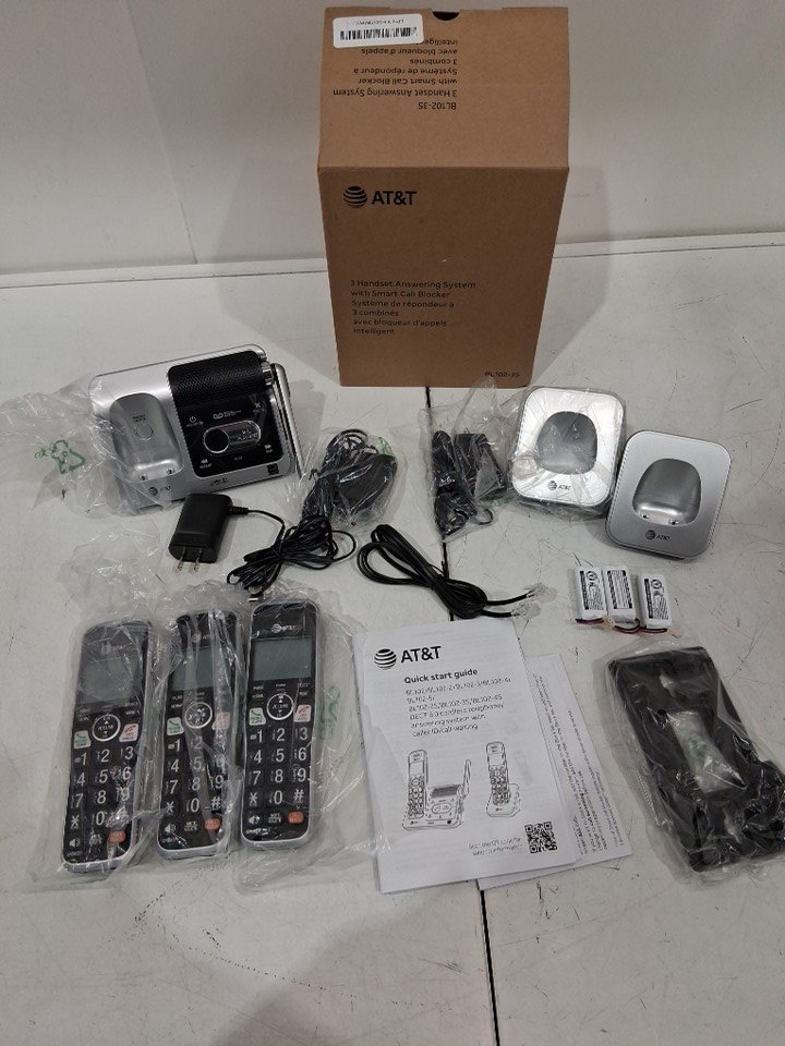 AT&T 3-HANDSET EXPANDABLE CORDLESS PHONE WITH ANSWERING SYSTEM XL DISPLAY BACKLIT BUTTONS VISUAL RINGER - BLACK/SILVER (MODEL: ‎BL102-3S)