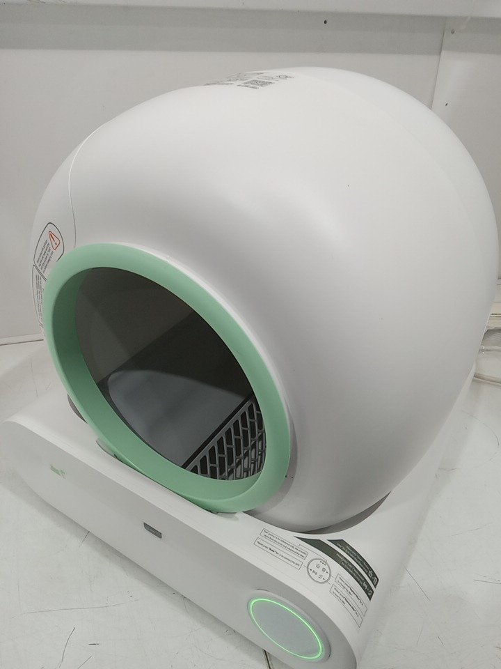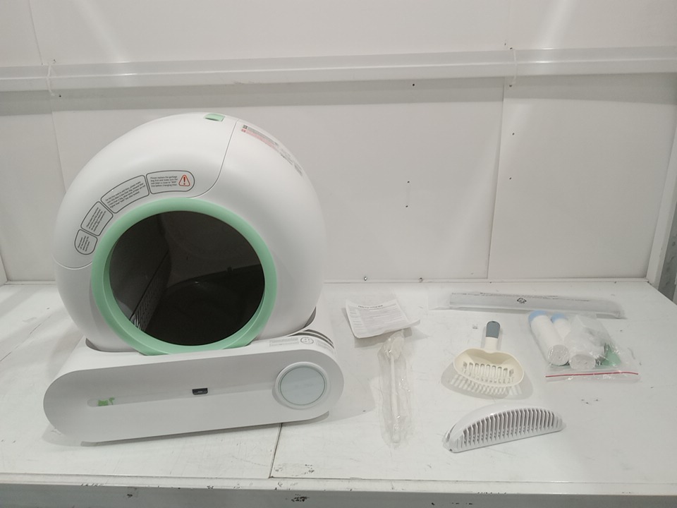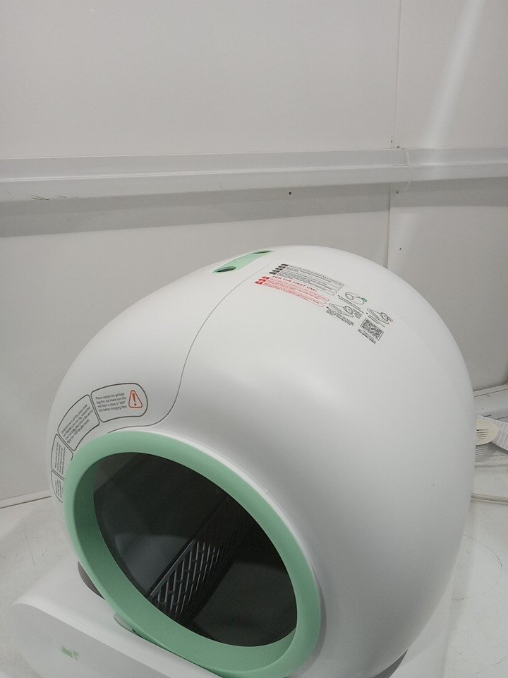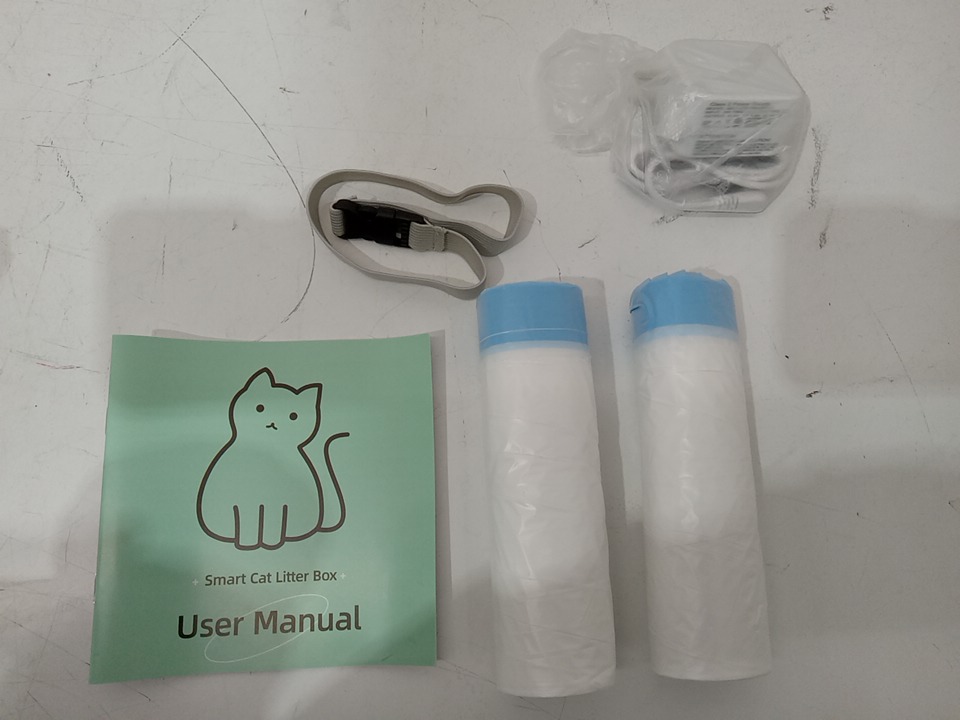 Please note that this product has been repackaged. There are minor dirt and hair residue inside the litter box, there are minor scratch marks around the cat litter box from previous use. Tested for power and motor function. (Please see photos)