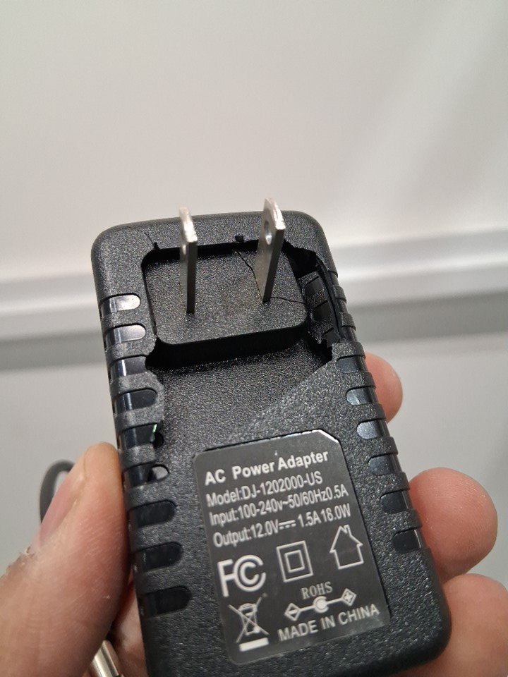 + The power adapter is cracked/broken but still works. We recommend replacing this as it is unsafe +