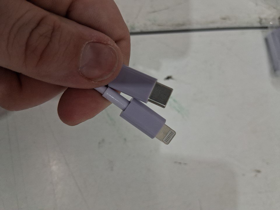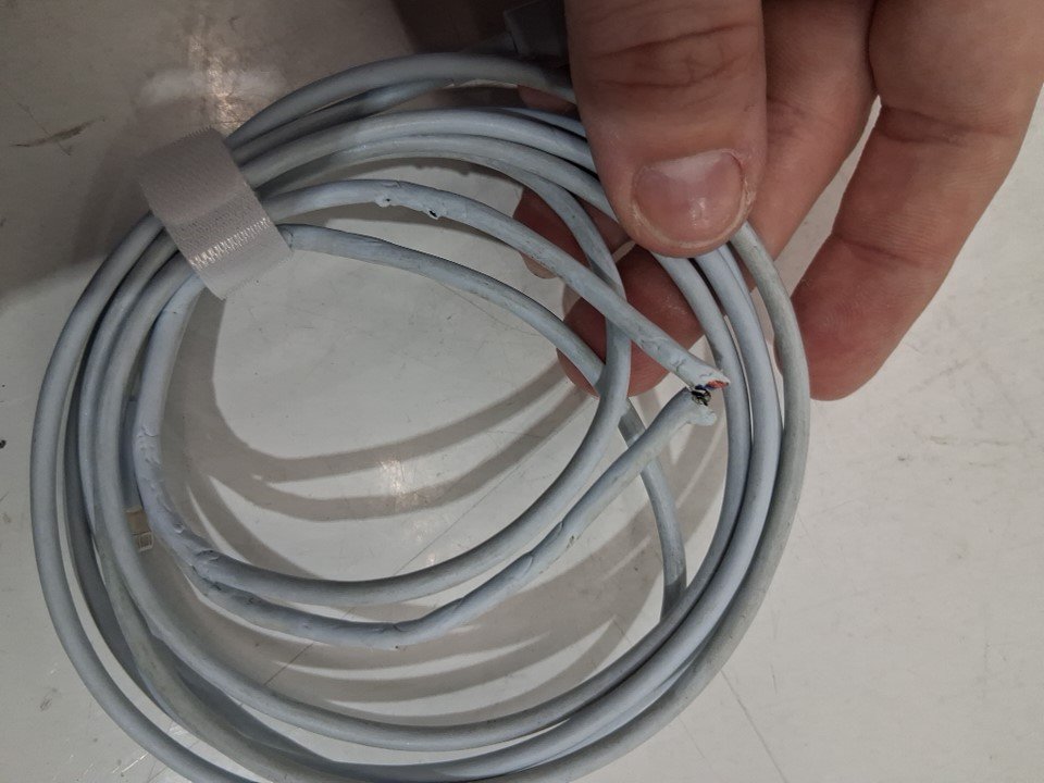 Blue cable shows signs of distress such as exposed wires and discoloured rubber coating.