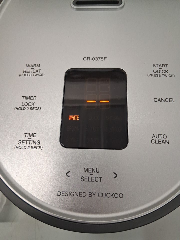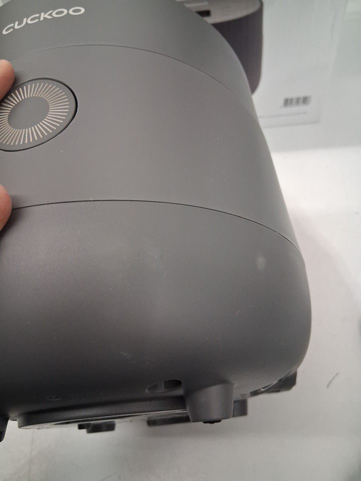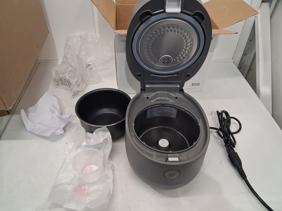 Rice cooker is brand new however has light discoloration on outer casing from manufacturing. Power cord is missing, requires a basic 3 prong house cord