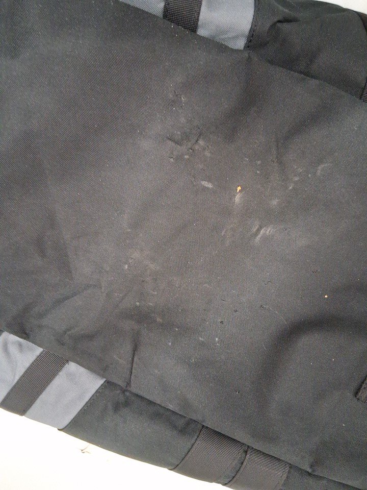 Bag has some minor dirt stains and some tears in the surface fabric