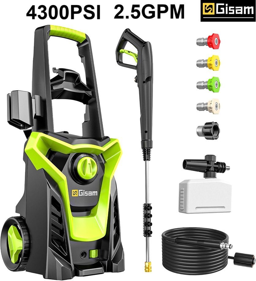 Gisam compact hight-slow electric pressure washer with 4 nozzles and foam sprayer - 26ft hose - 4200psi - 2.5gpm - (model: c12)
