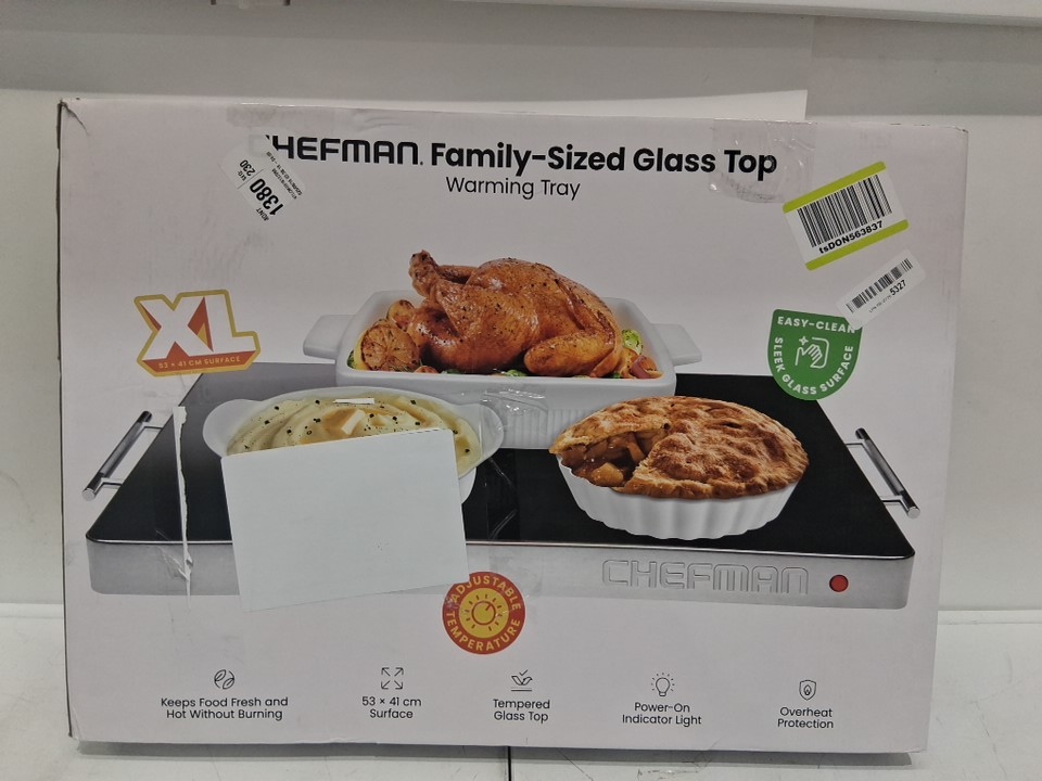 CHEFMAN FAMILY SIZE GLASSTOP WARMING TRAY WITH TEMPERATURE CONTROL - 400 watts -21" x 16" - BLACK/STAINLESS STEEL - (MODEL: RJ22-TC-v2-ca)