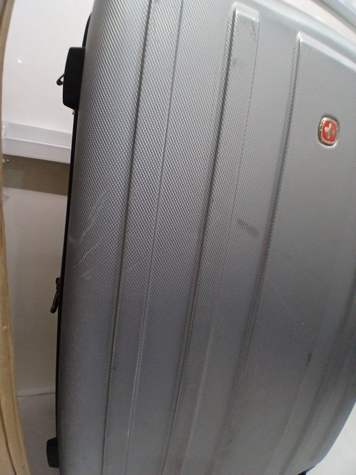 Surface is scuffed and has a crack/hole at the bottom corner.