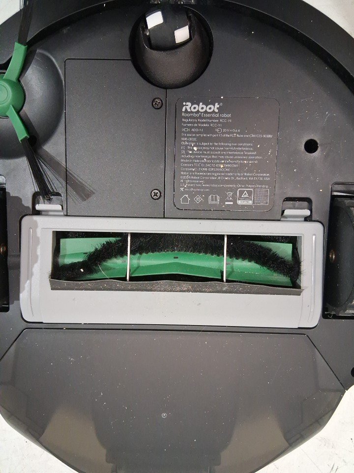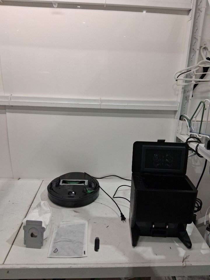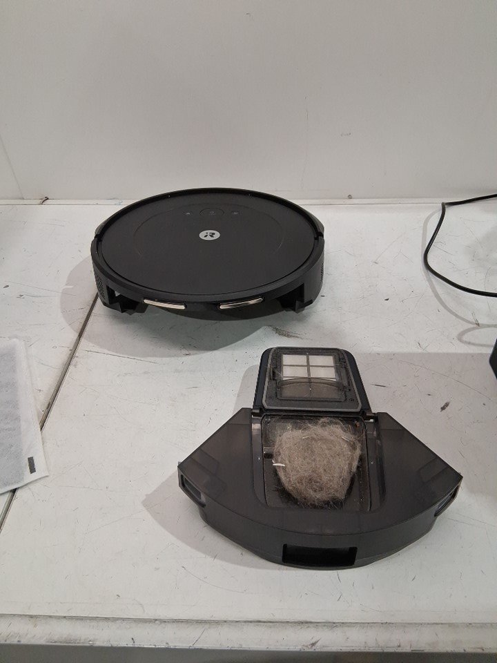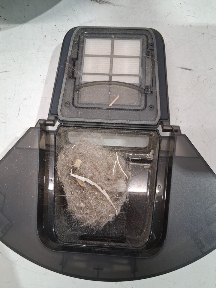 Products filter has a considerable amount of dust and hair inside the filter cartridge as well as the Roomba's filter and dust catcher. Roomba robot also has some minor damage to the front of the product. Product was tested for basic power robot will charge on dock, however battery of robot was dead so further testing could not take place.