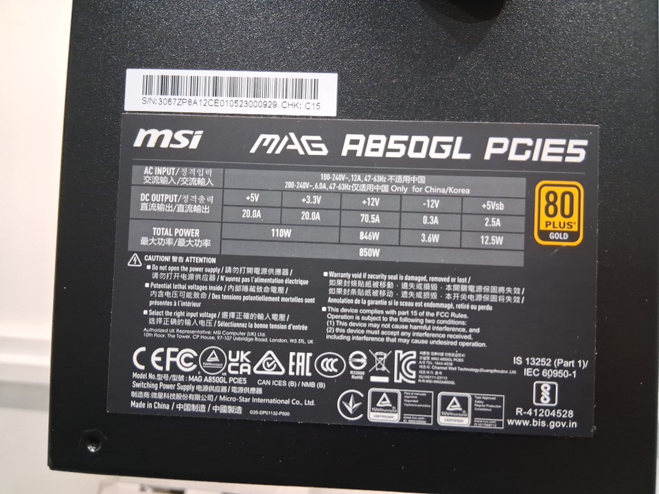 MSI MAG A850GL PCIE 5 & ATX 3.0 Gaming Power Supply unit psu - 850W, Fully Modular, 80 Plus Gold Certified - black (MODEL: A850GL)