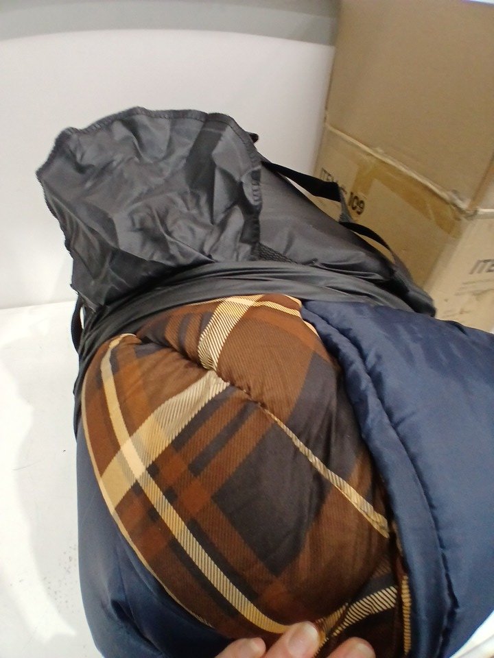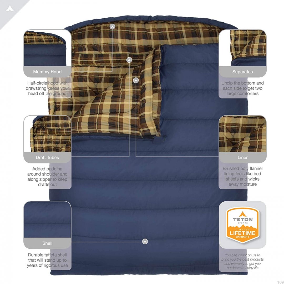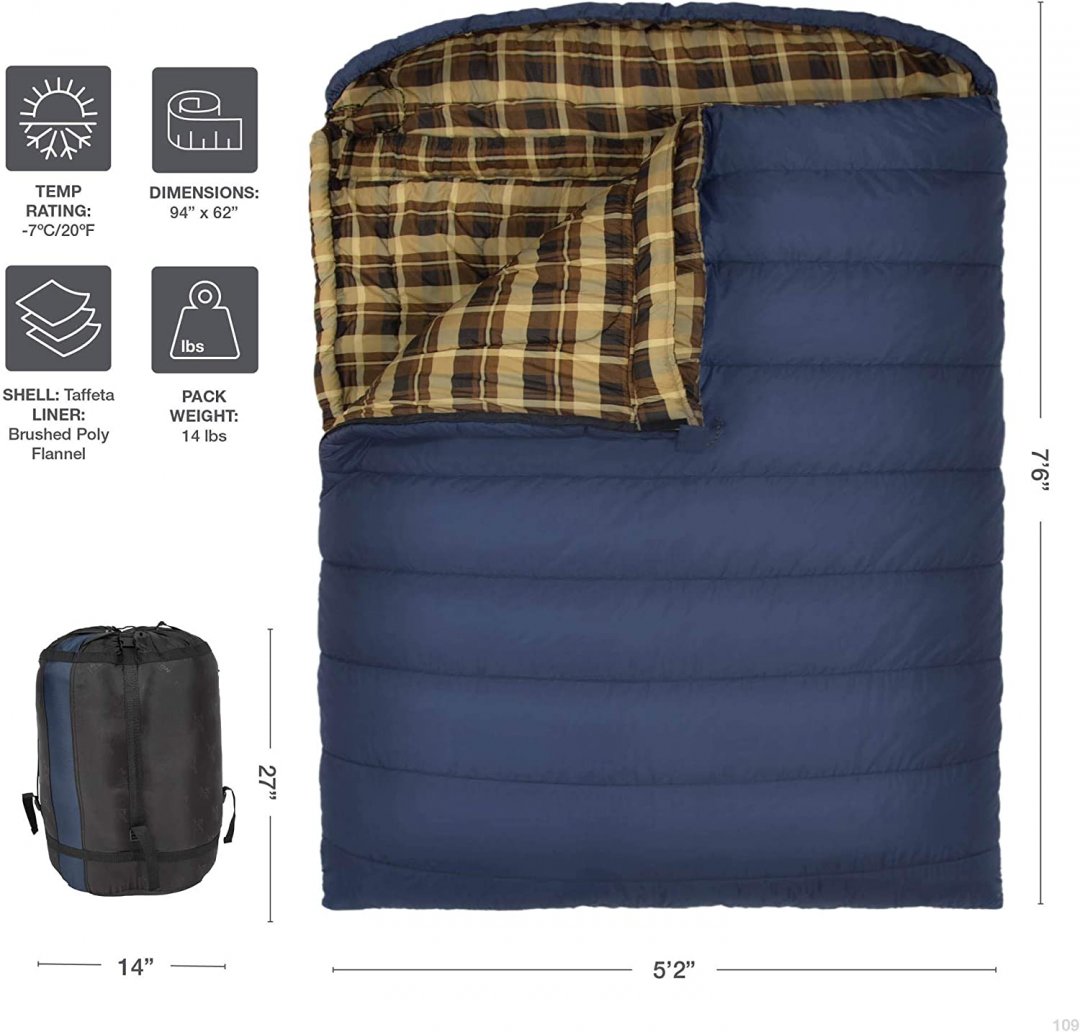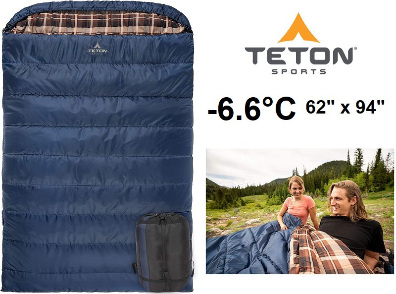 TETON SPORTS CANVAS 20˚F (-6.6°C) MAMMOTH DOUBLE SLEEPING BAG - QUEEN SIZE, BLUE WITH BROWN PLAID (MODEL: 109)