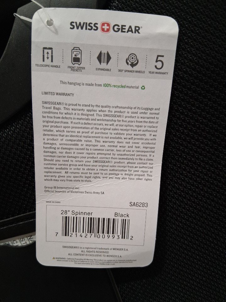 SWISSGEAR SION ROLLING LUGGAGE CASE - 29" - BLACK (MODEL: SA6283)