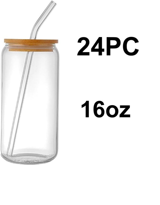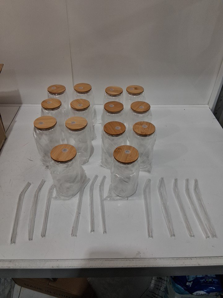 24PC glass cups with bamboo lids and straws - 16oz - (14) cups, (10) straws - clear