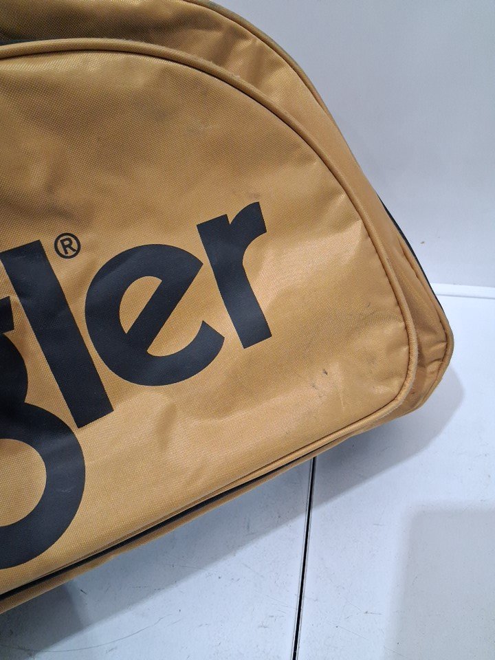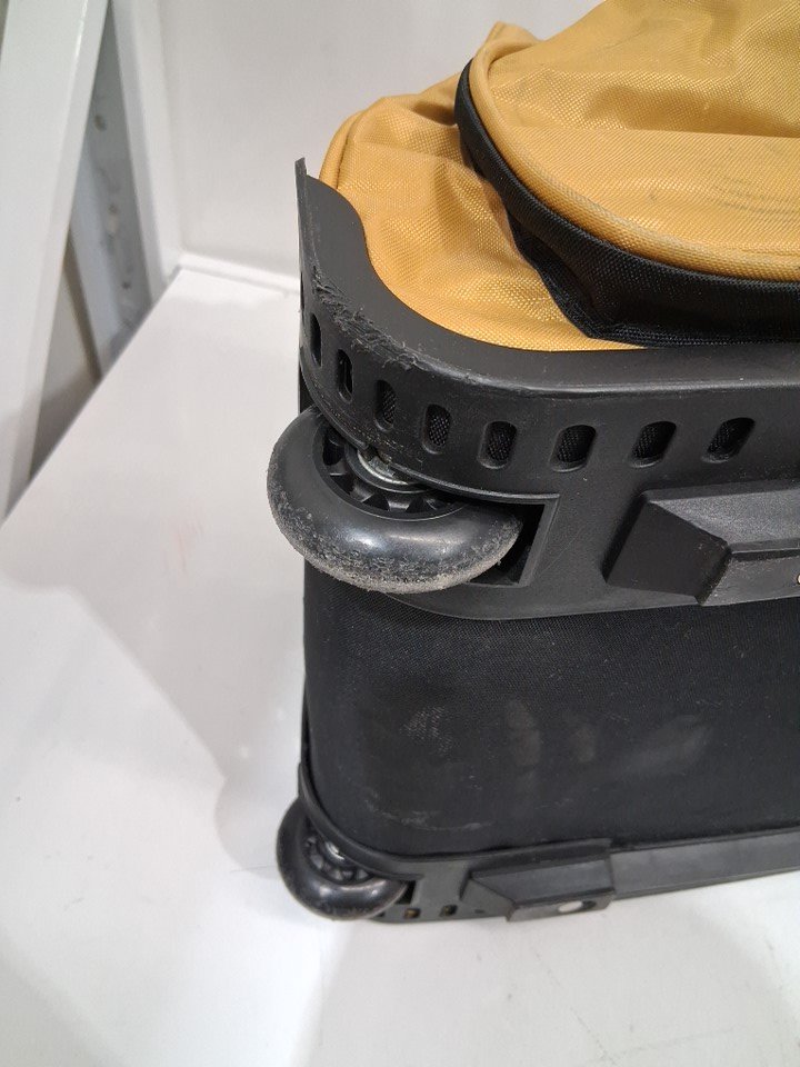 item has wear on the wheels, scuffs around the wheels and marks/dirt throughout