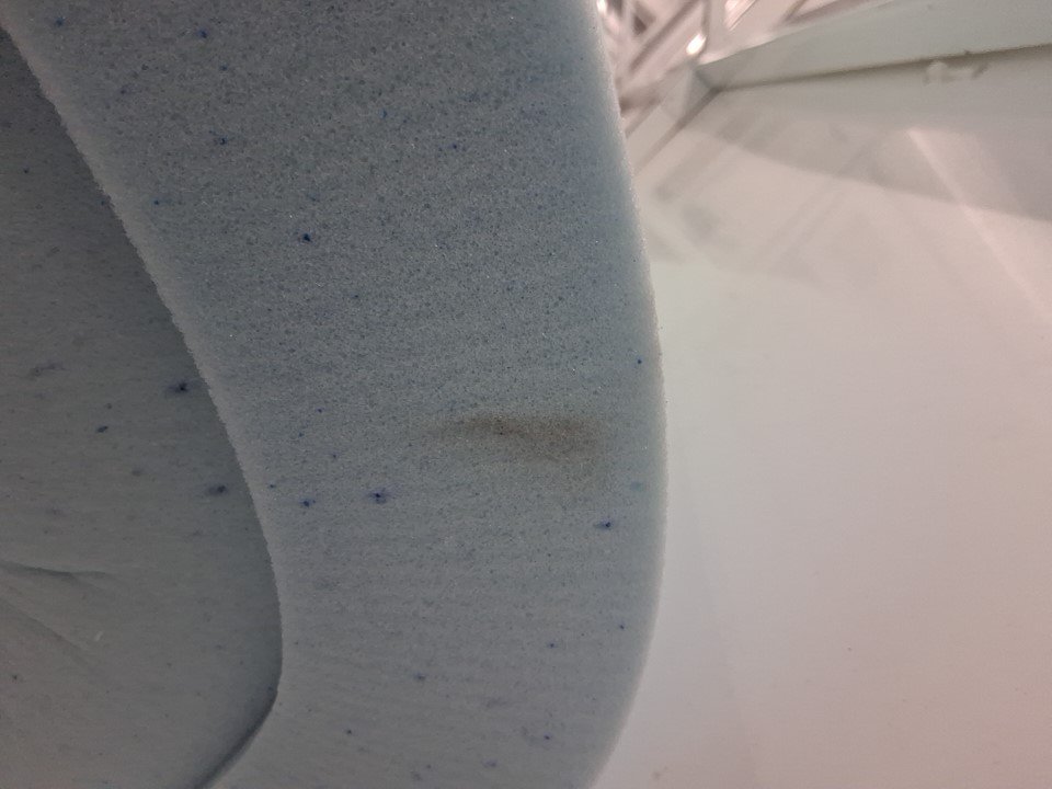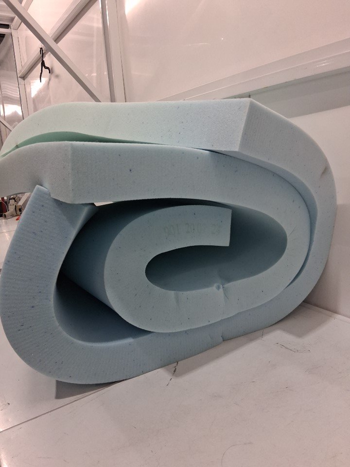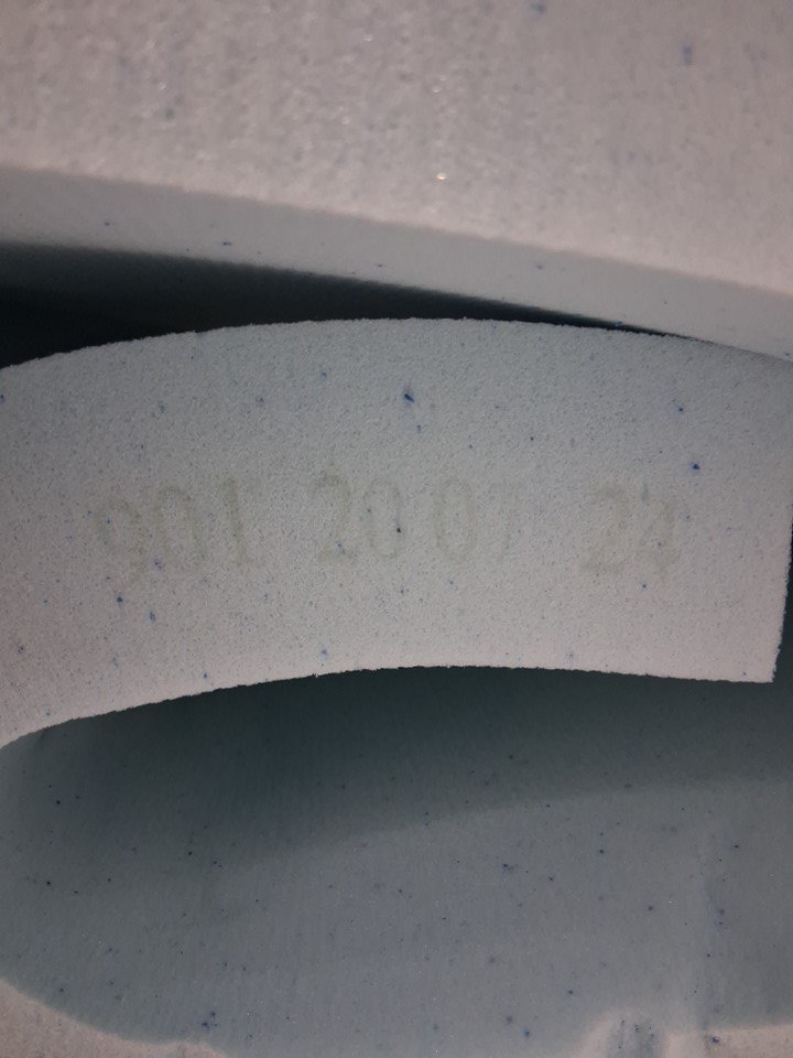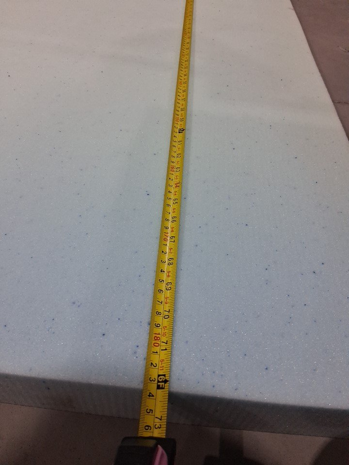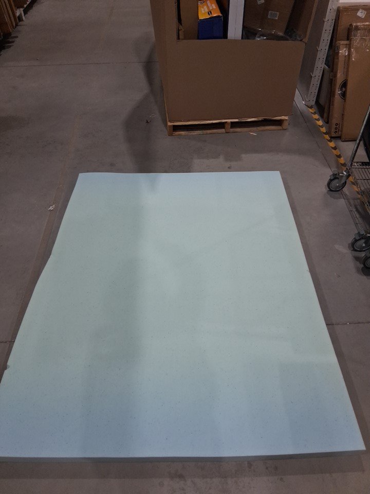 No packaging or labels, estimated size for queen bed. Some dust on foam, see photos