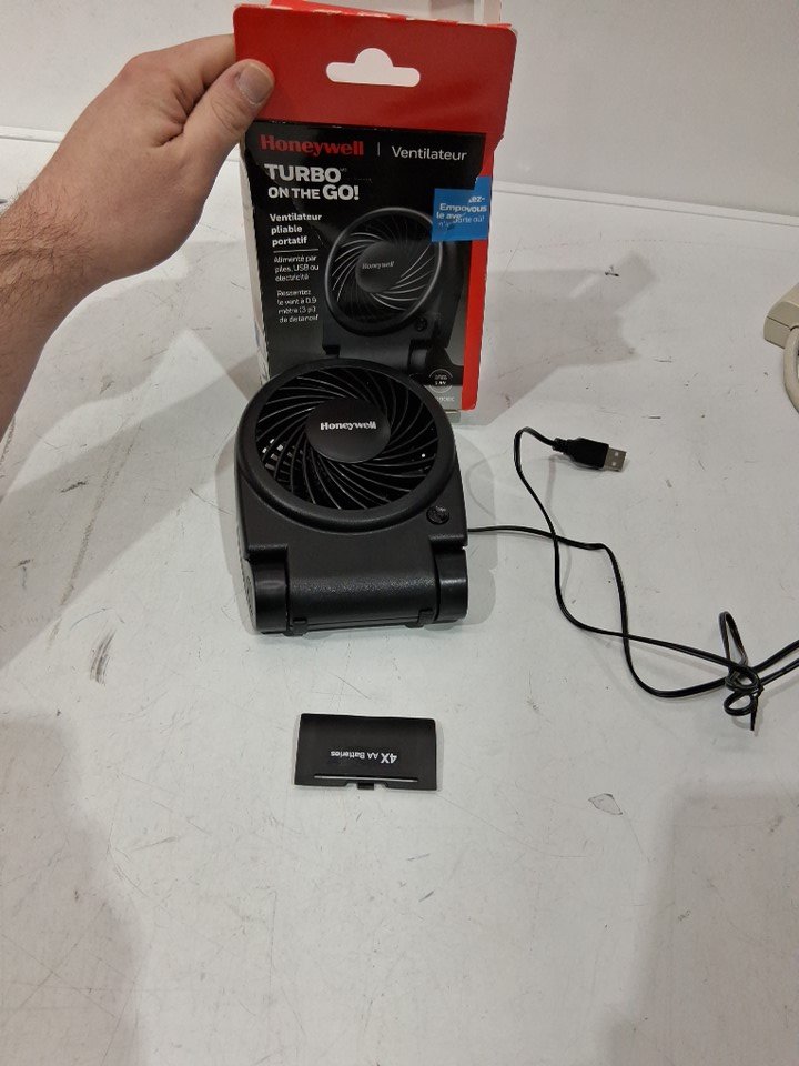 HONEYWELL TURBO ON THE GO! PORTABLE BATTERY-OPERATED OR PLUG-IN TRAVEL FAN - 6" - BLACK (MODEL: HTF090BC)
