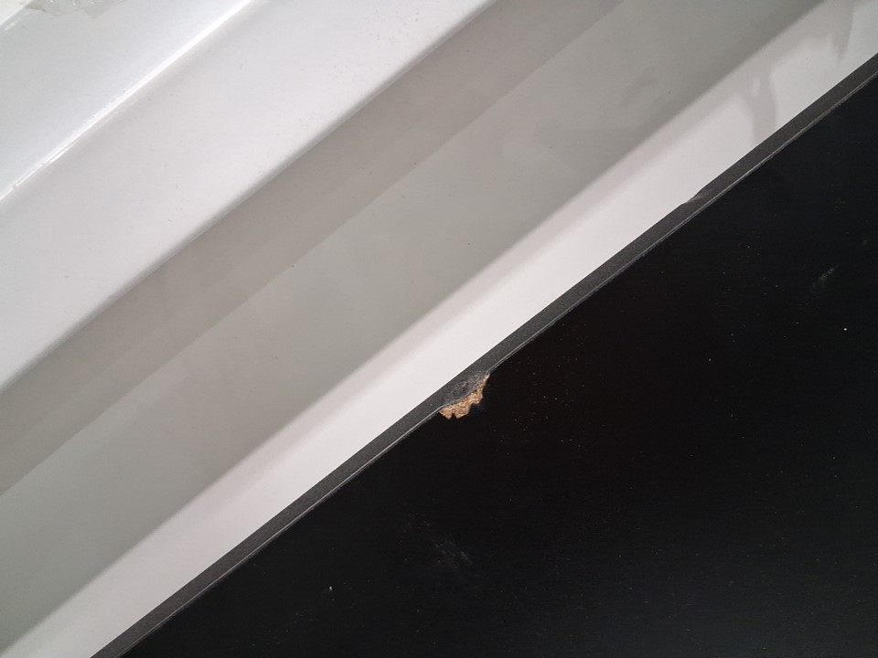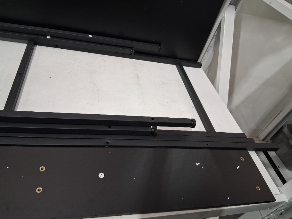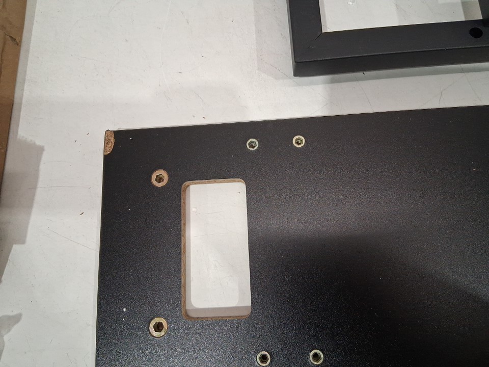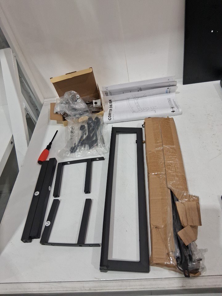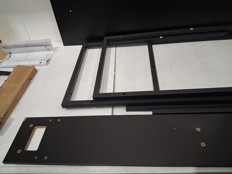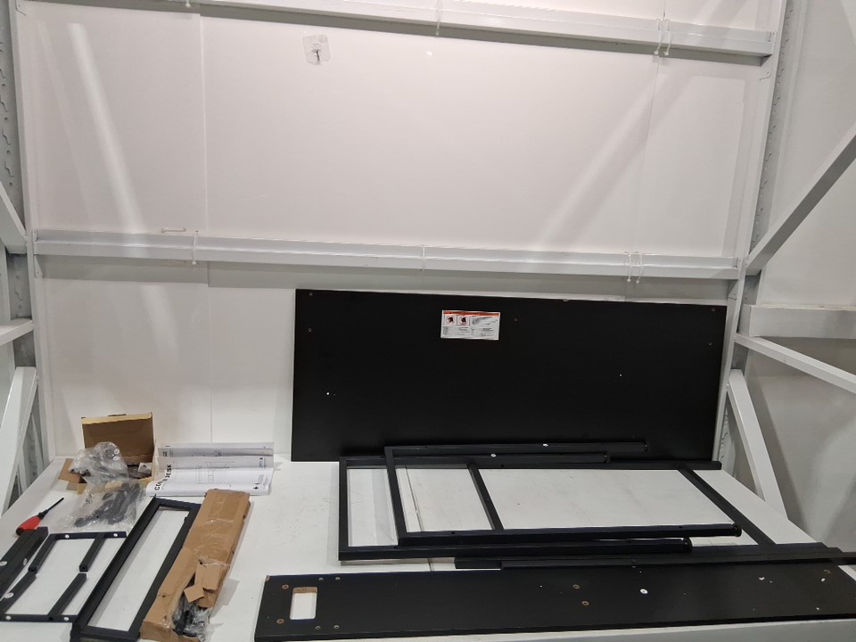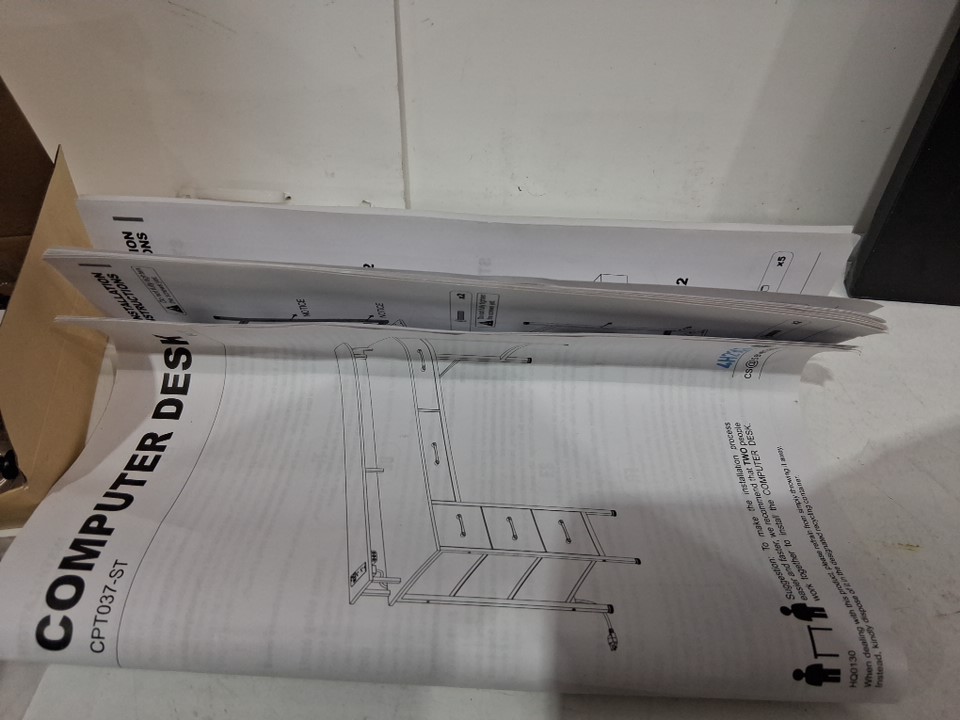 Some hardware is missing because the bags were opened, it doesn't have fabric drawers, and some corners are damaged.