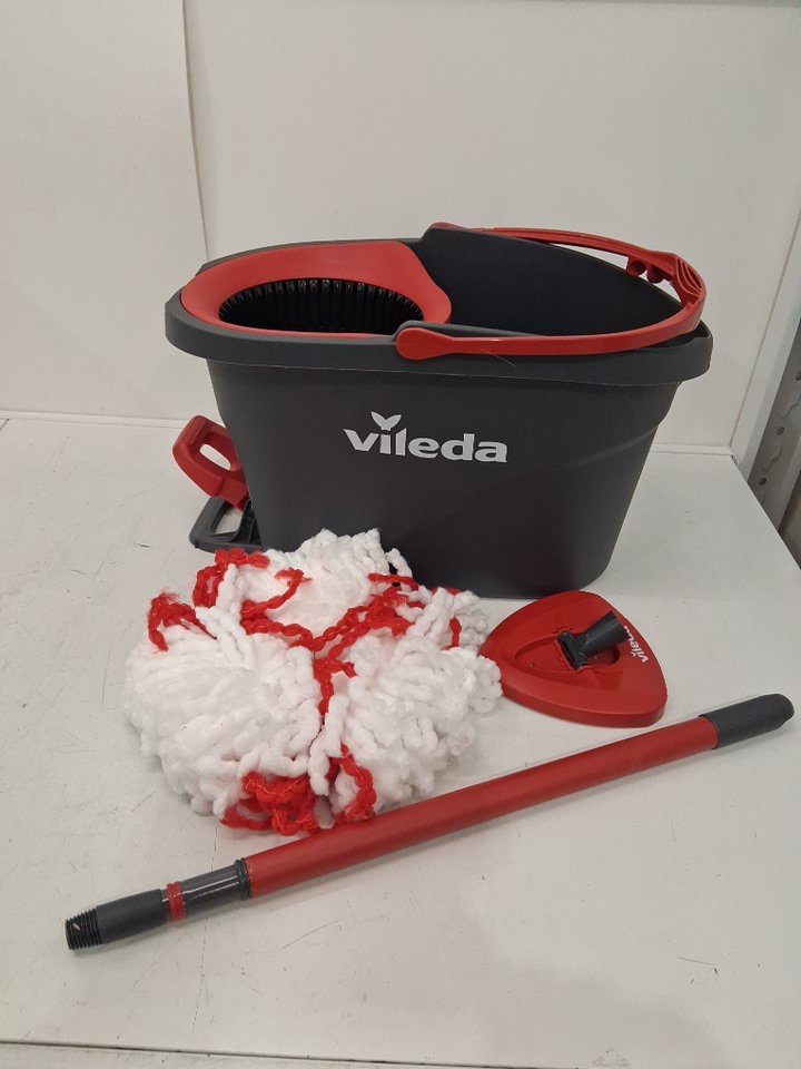 VILEDA EASYWRING POWER SPIN BUCKET SYSTEM WITH EXTENDABLE POLE and 2 mop heads- 22" - 48" - GREY/RED - (MODEL: 172880)