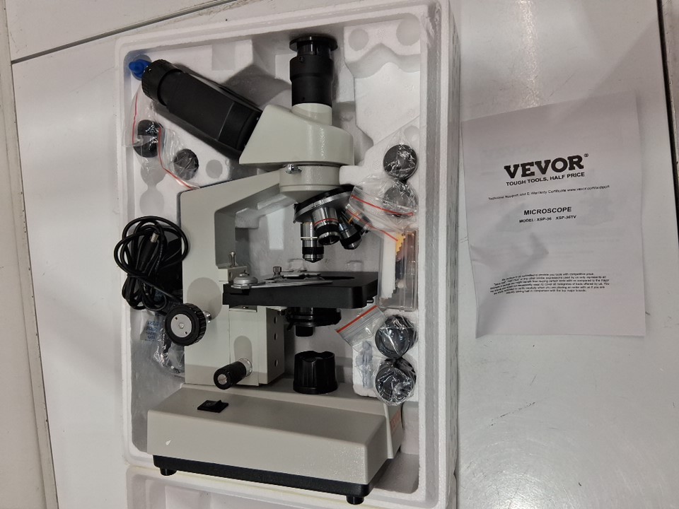 VEVOR Compound Trinocular Microscope, 40X-5000X Magnification, Trinocular Compound Lab Microscope with LED Illumination & External Interface, Two-Layer Mechanical Stage, Includes Microscope Slides (model: xsp-36tv)