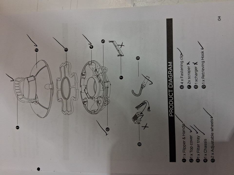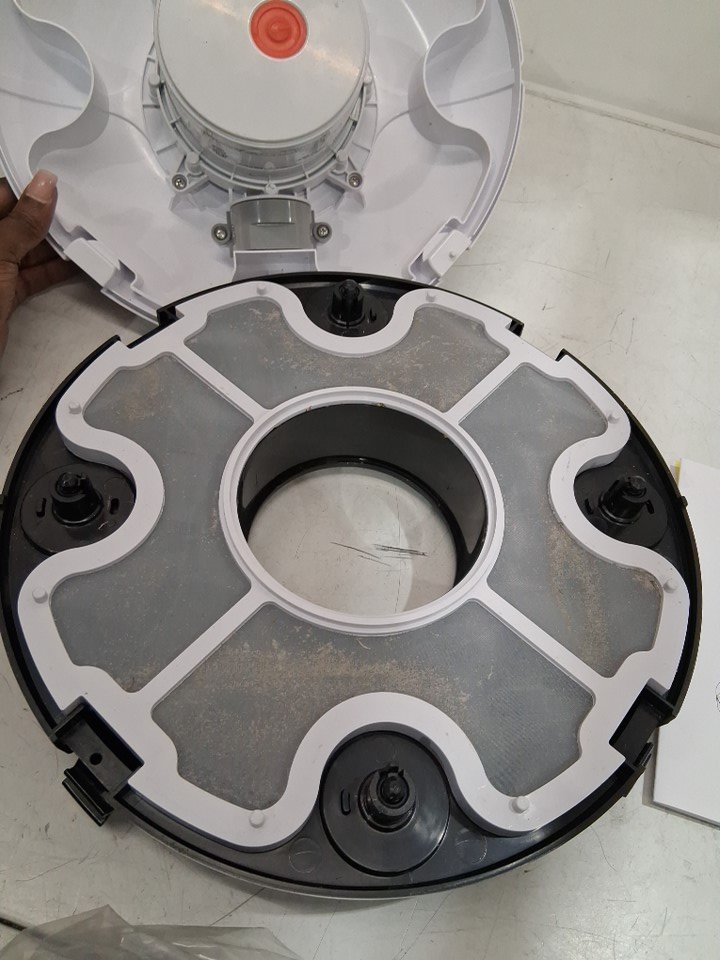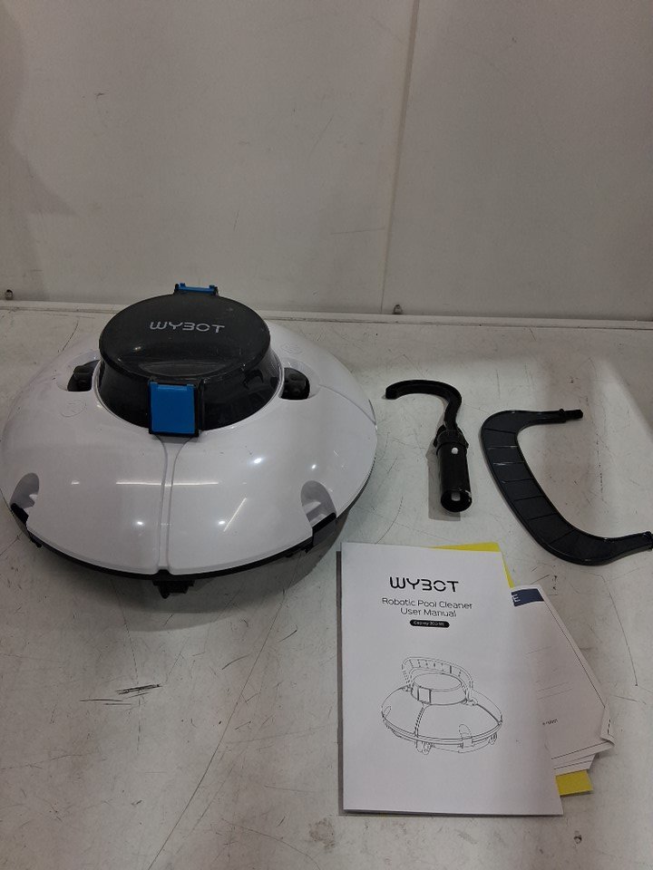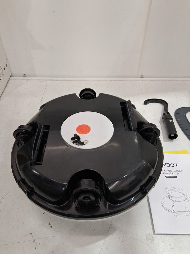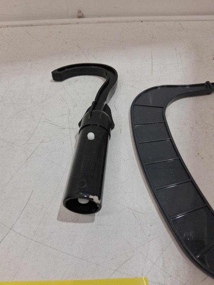 The item has dirt inside the vacuum, is missing the charger and two scrapers. There’s a visible stain on the hook, along with some smudged marks on the vacuum. Testing for power is not possible due to the absence of a power cable.