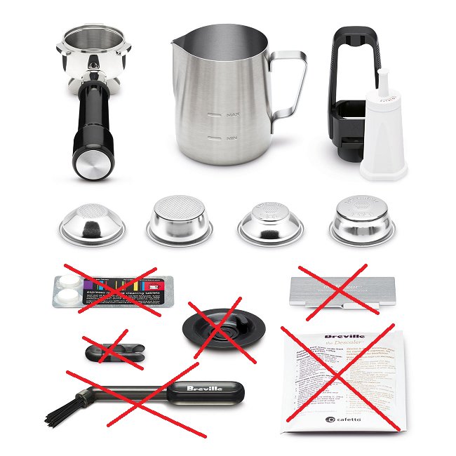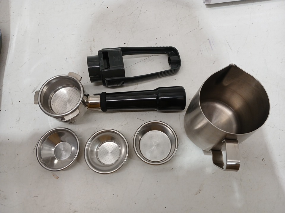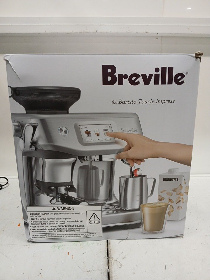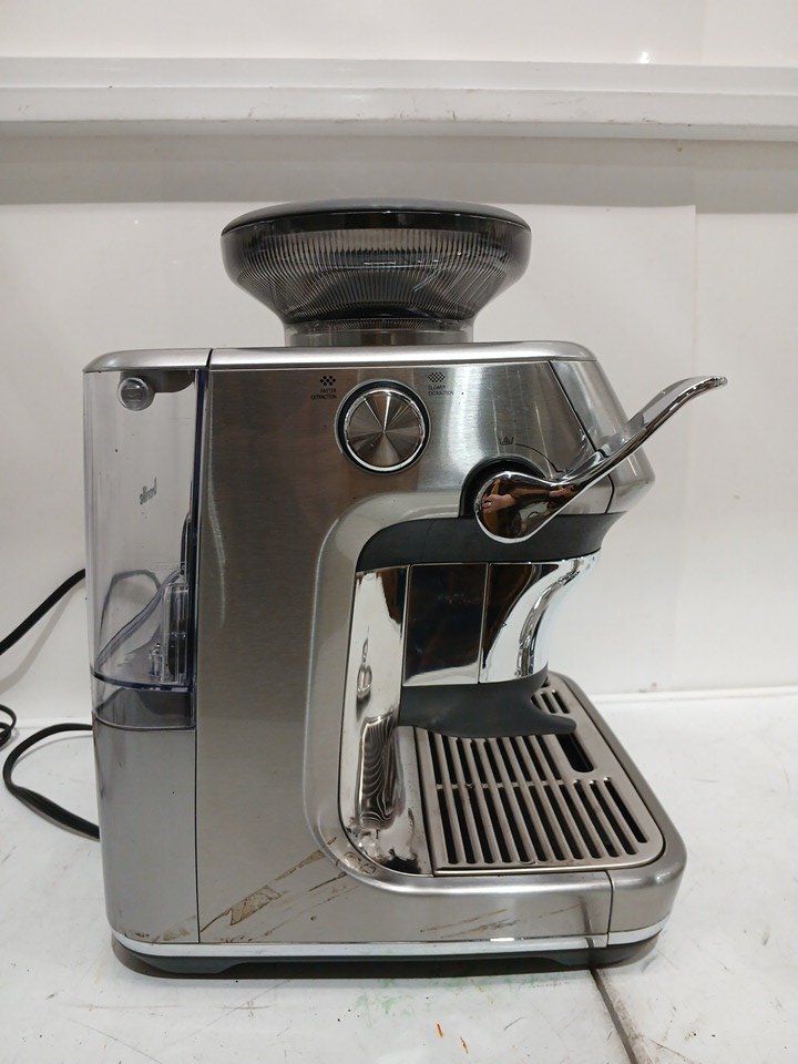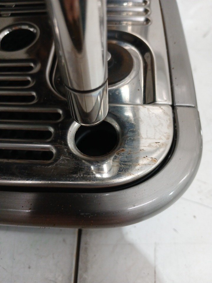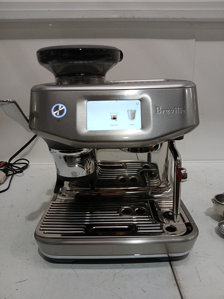 there is coffee residue & light scuffs present throughout due to previous use. tested for power only. missing several accessories, but replacements can be purchased here: https://www.breville.com/en-ca/product/bes881 This item will not be eligible for our warranty unless the machine was descaled & cleaned using the manufacturer's instructions. If you require additional time for our warranty in order to clean these machines, please reach out to us before your specified warranty deadline. **Due to the high sensitivity and frequent upkeep of operation on these units, additional cleaning may be required. If not descaled with model specific cleaning product, the units may become clogged and will cause potential operational issues. Please refer to the manufacturers operations manual for detailed cleaning instructions.**