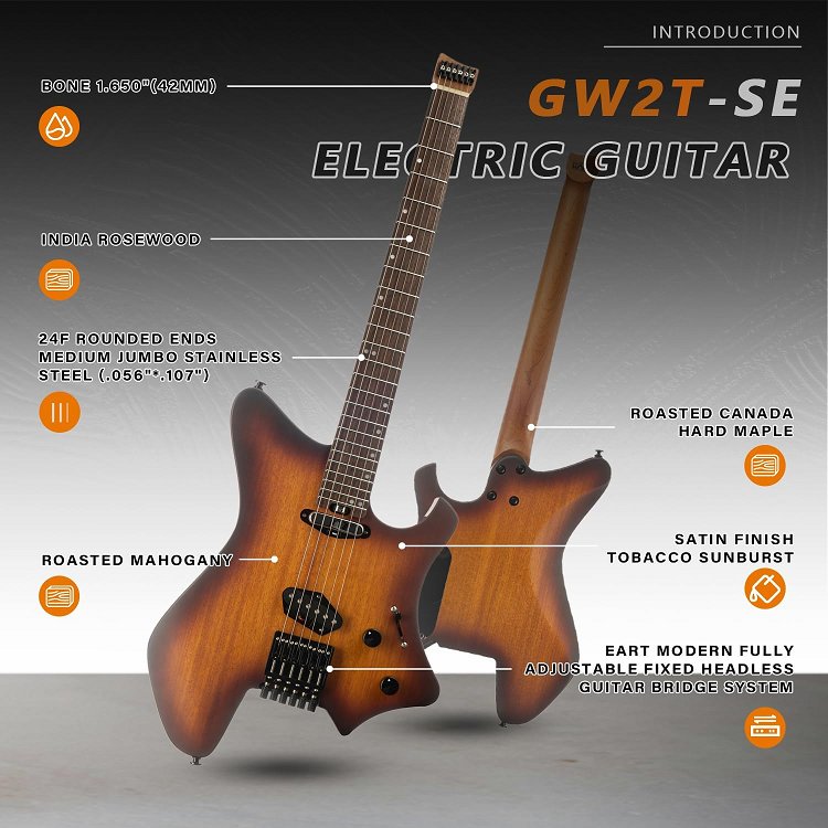 EART GW2T-SE Headless Electric Guitar, Roasted Mahogany Body with Roasted Canada Hard Maple Standard Artones - Tobacco Sunburst