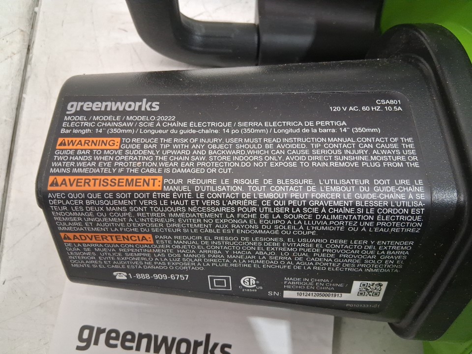 GREENWORKS ELECTRIC/CORDED CHAINSAW - 14" BLADE - 10.5A - GREEN (MODEL: 20222CA)
