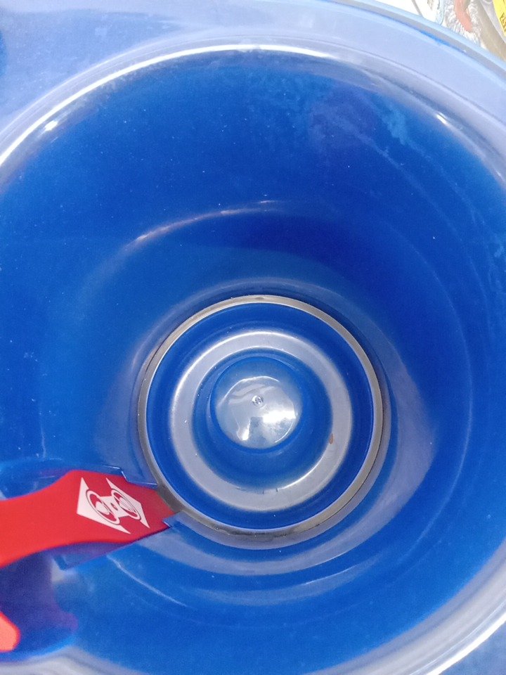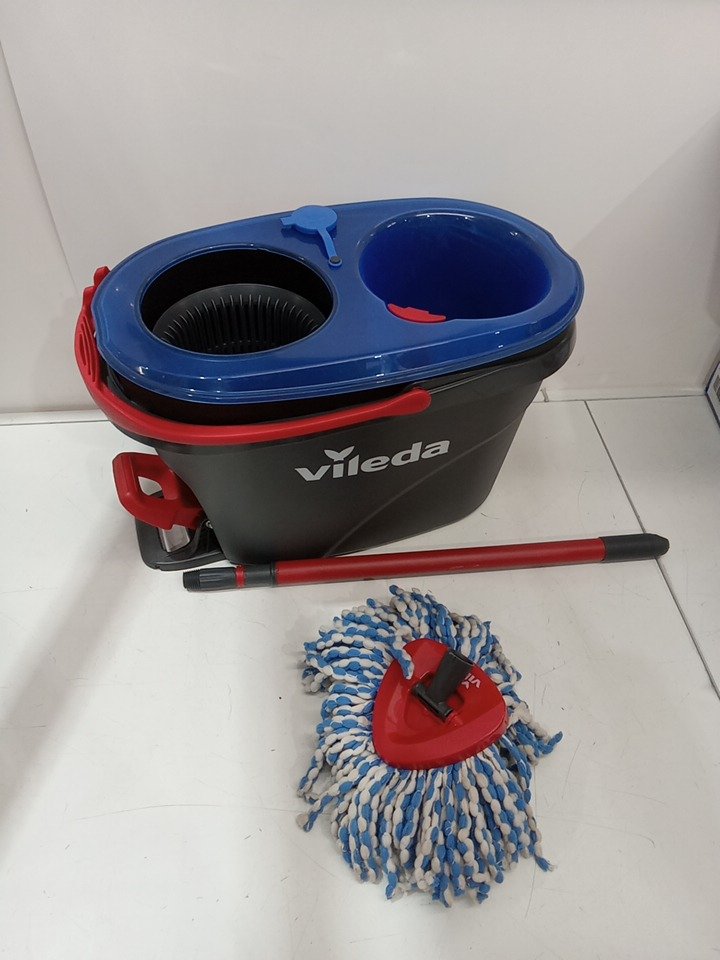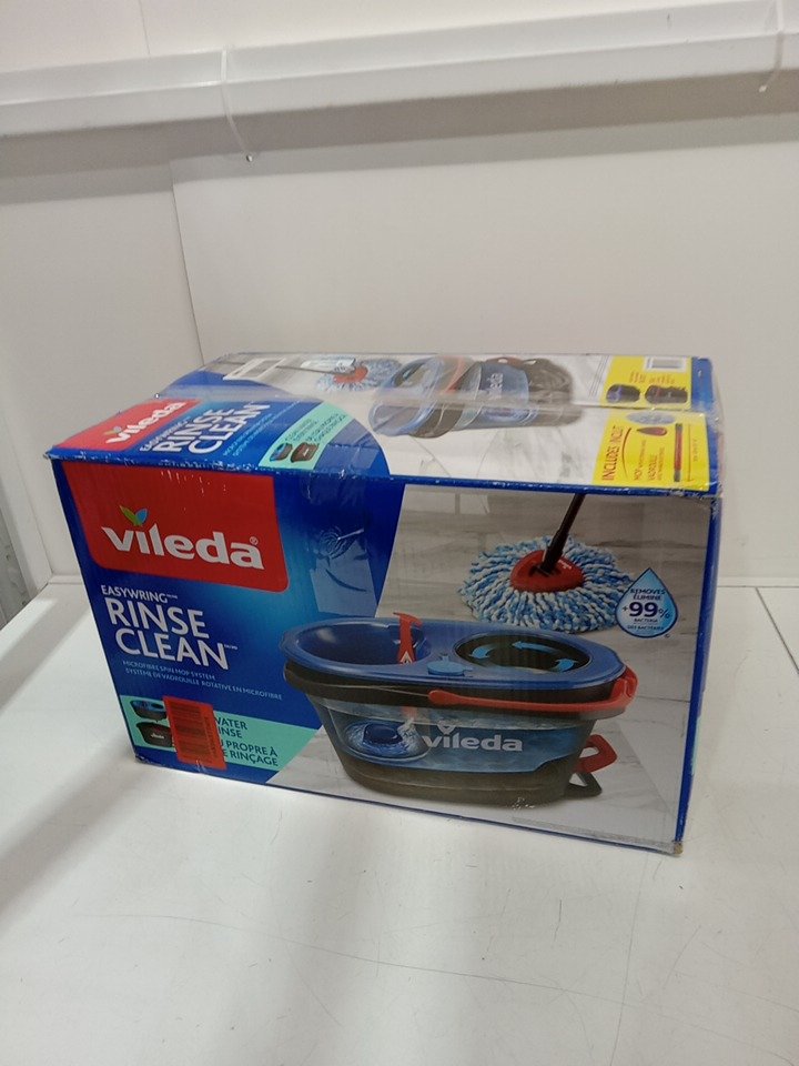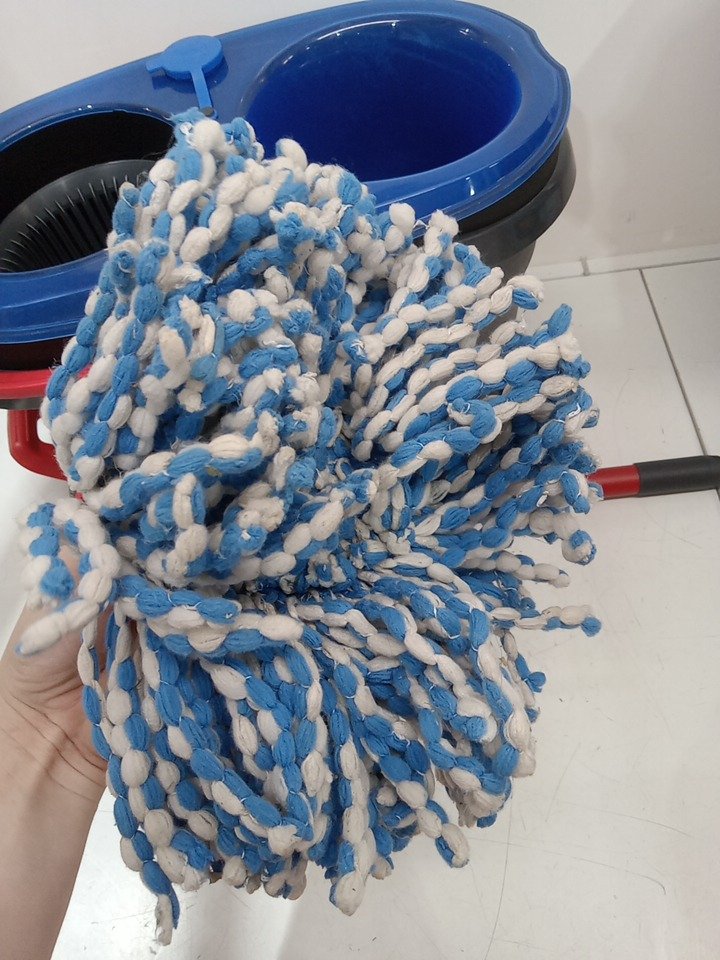 The mop head is dirty but can likely be cleaned. Faint water marks in it form previous use.