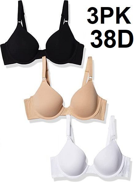 3pk women's fruit of the loom underwire light lined t-shirt bras - 38D- black/white/beige (style: ft797pka)