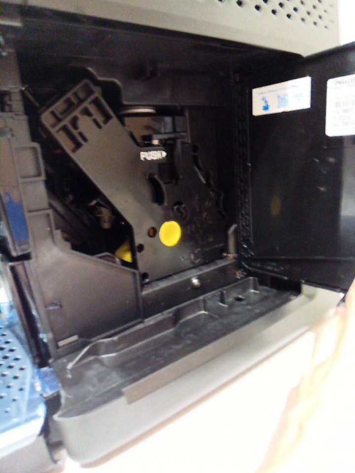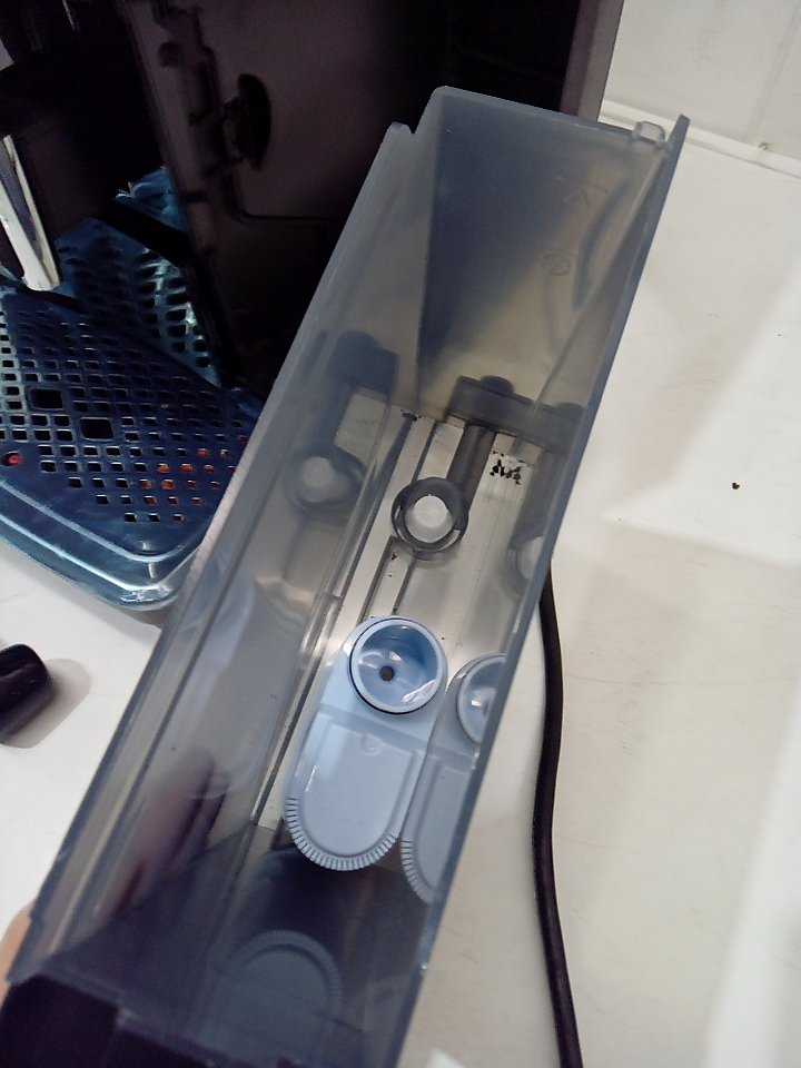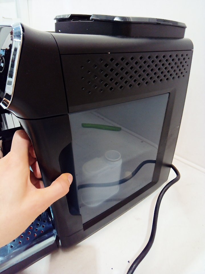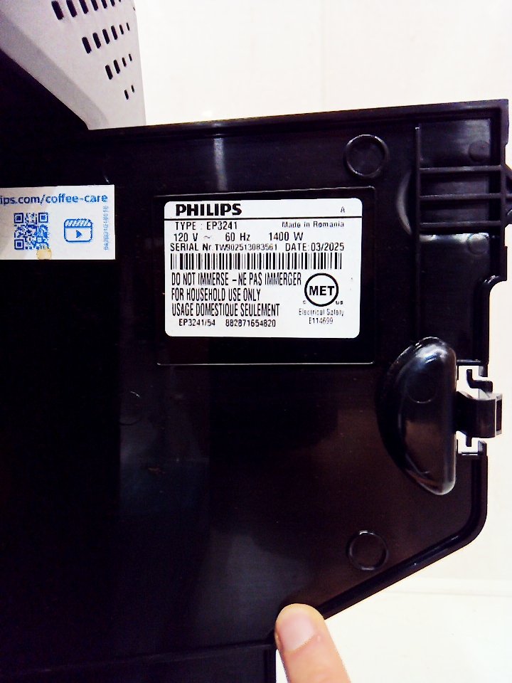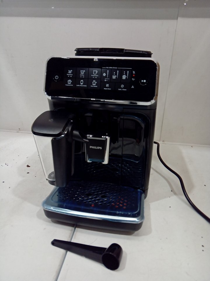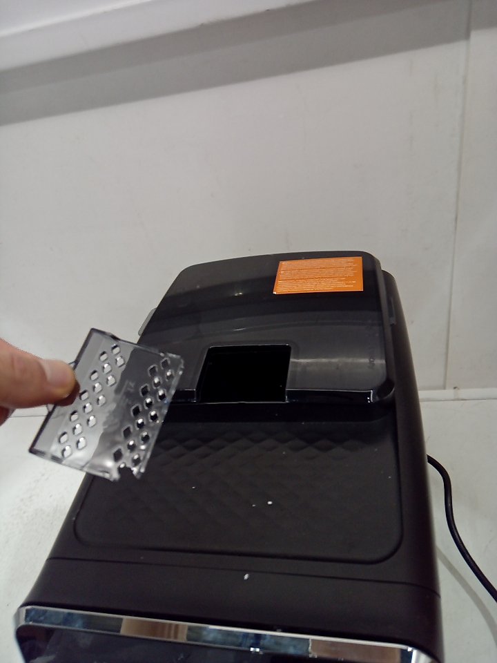 There are light scratches and coffee/adhesive residue on some parts of the machine. One of the hinges on the corner of the small plastic flap piece for the top has cracked off. Ours does not include any cleaning or descaling accessories. Tested for power. (SEE PHOTOS)