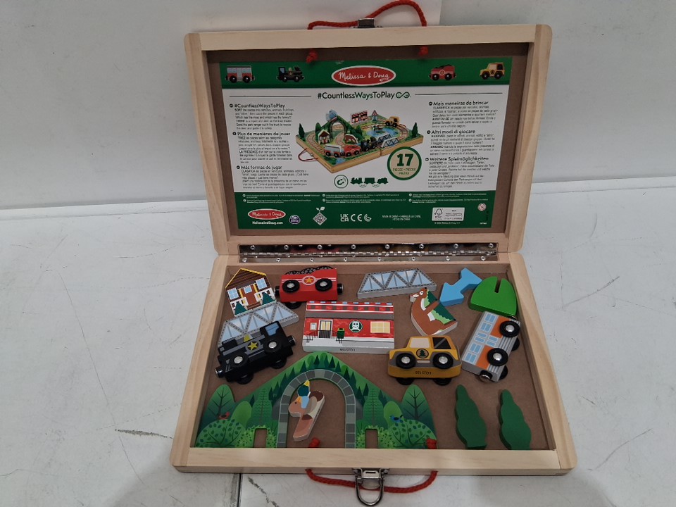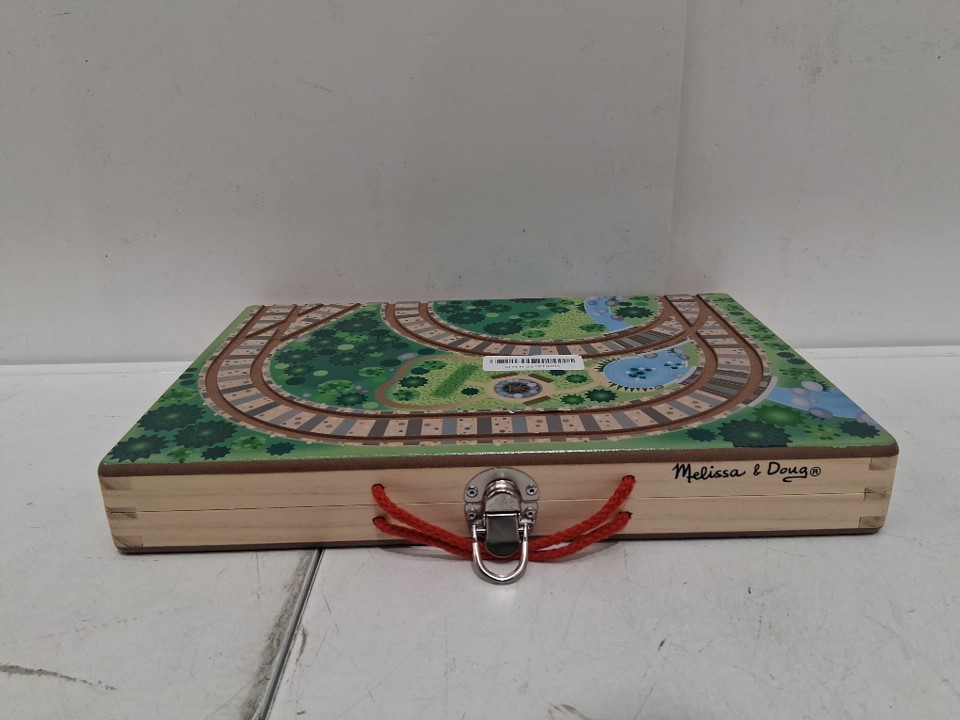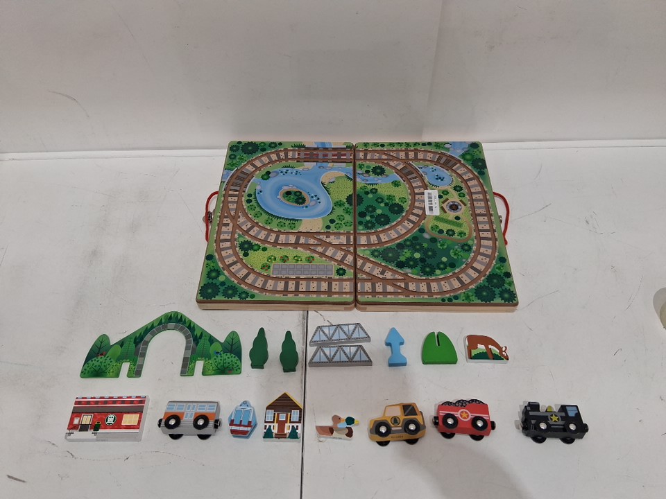 17PC MELISSA AND DOUG TAKE-ALONG RAILROAD PORTABLE TABLE TOP WOODEN TRAIN SET
