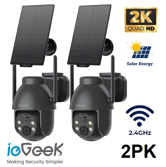 2pk iegeek wireless outdoor security cameras - 360° ptz 2.4g wifi camera system for home surveillance, solar & battery powered options with 2k color night vision - black (model: dq201)