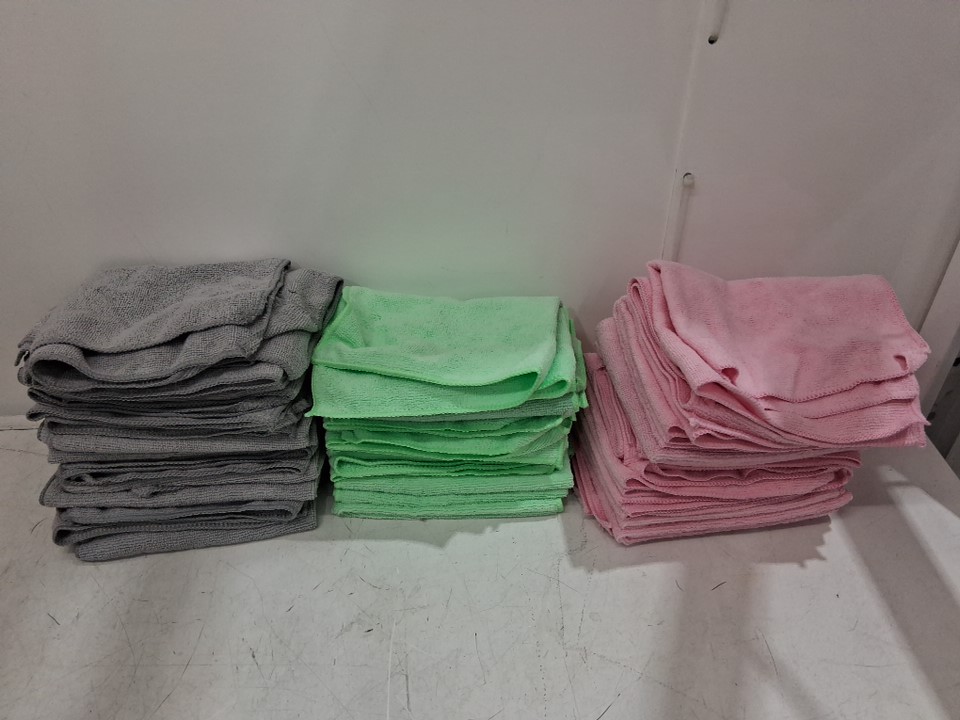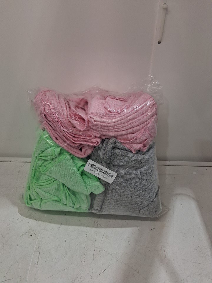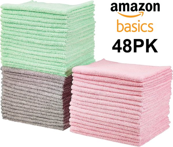 48PK Amazon Basics microfiber cleaning rags - 12'' x 16'' - Pink/Grey/Green