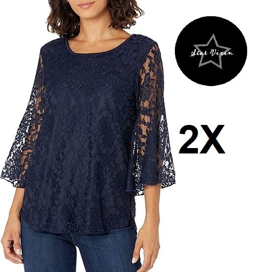 WOMEN'S STAR VIXEN STRETCH BELL SLEEVE LACE LINED TOP - SIZE 2X - NAVY